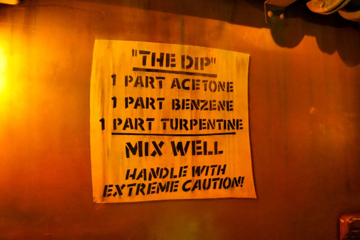 A sign states “The Dip” is made of acetone, benzene, and turpentine.
