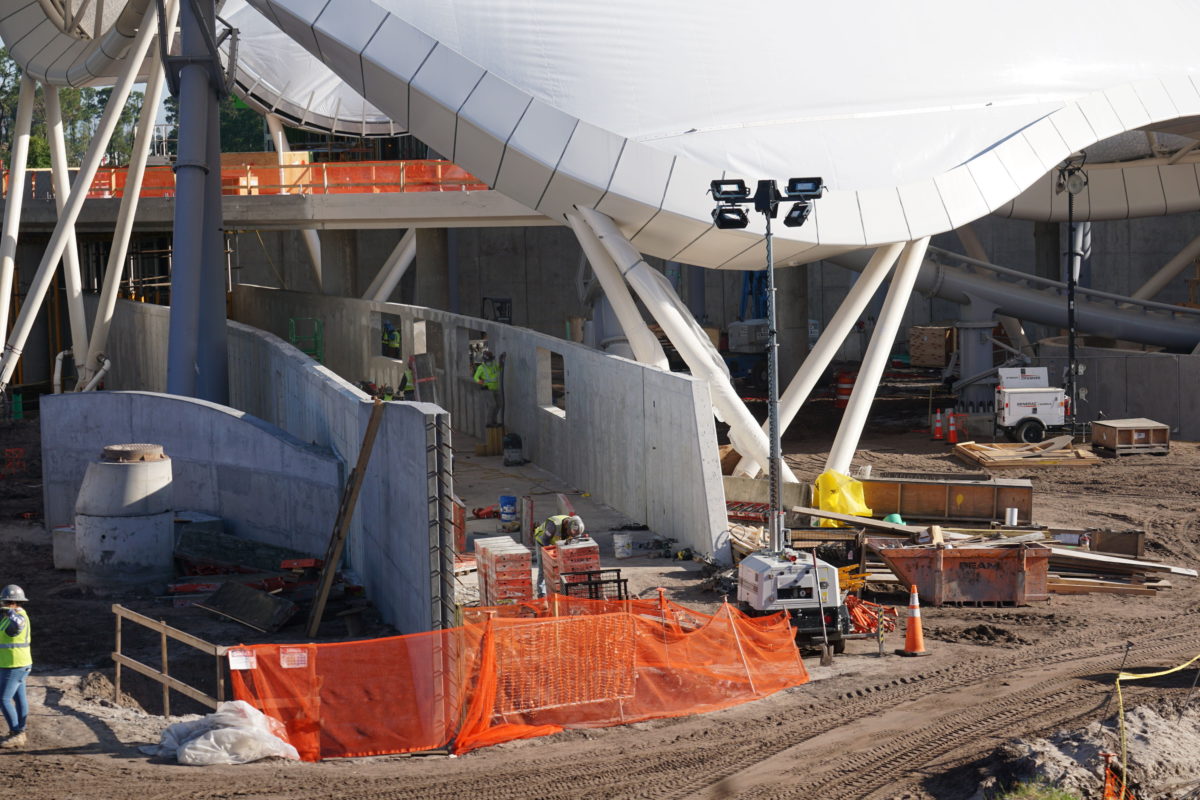 On the Tomorrowland side of the coaster, the walls leading out from under the canopy are now fully shaped and encased in concrete.