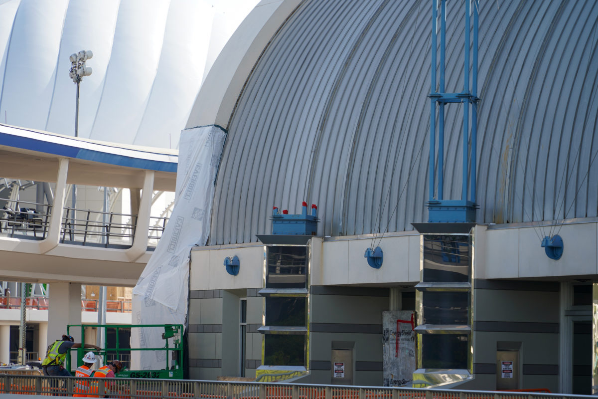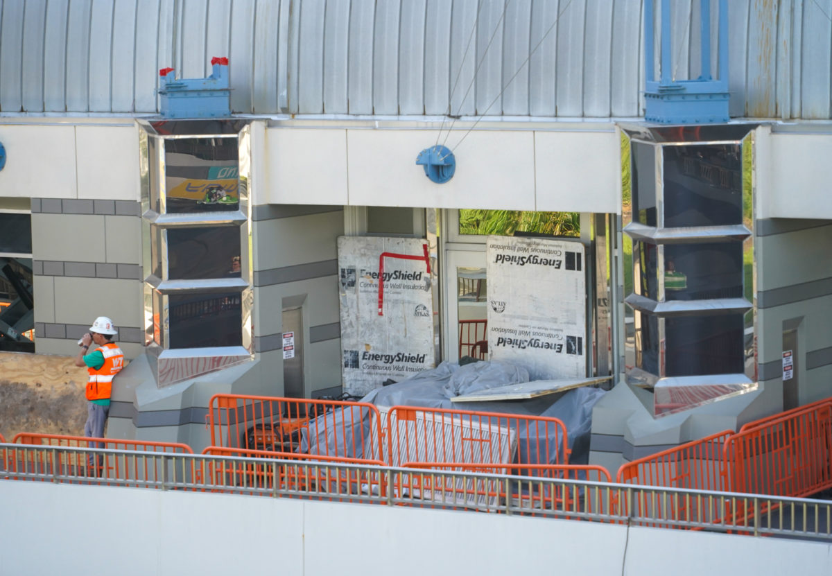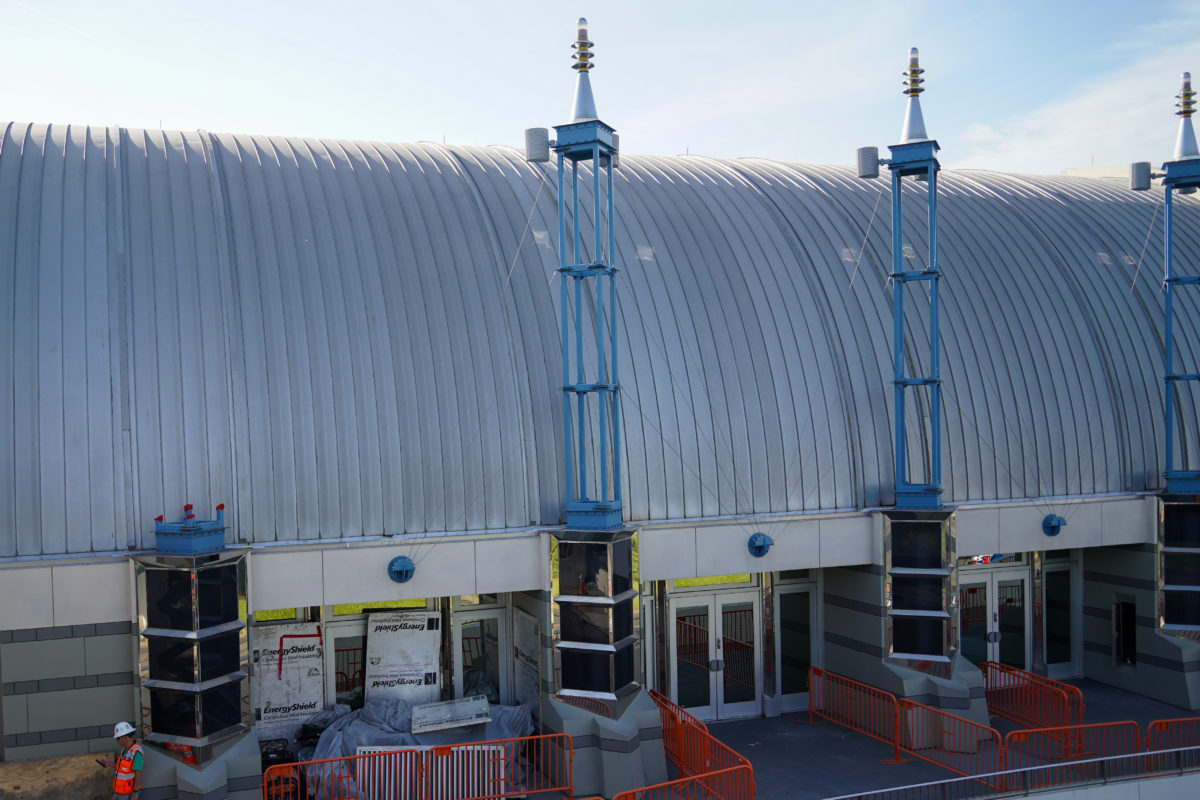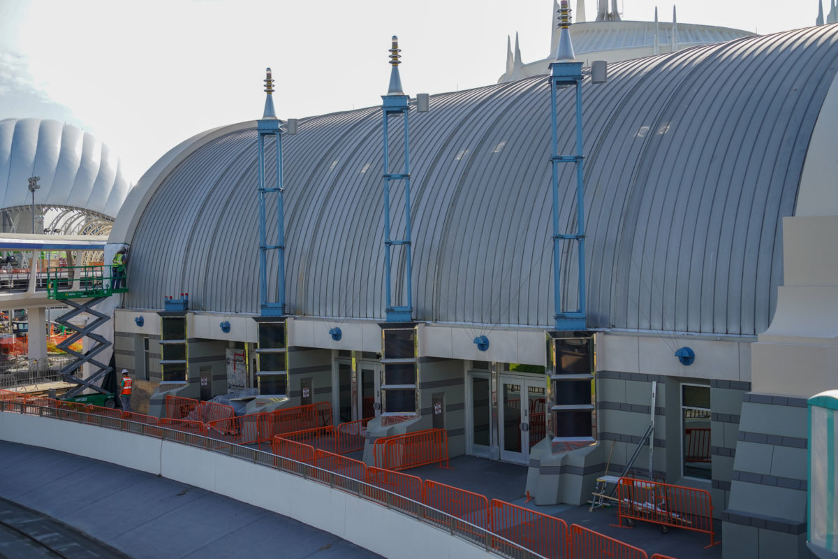 Construction is ongoing in Tomorrowland as the Magic Kingdom prepares for TRON Lightcycle / Run. Let’s take a look at the work on the Tomorrowland Light & Power Co. shop at the exit of Space Mountain.
