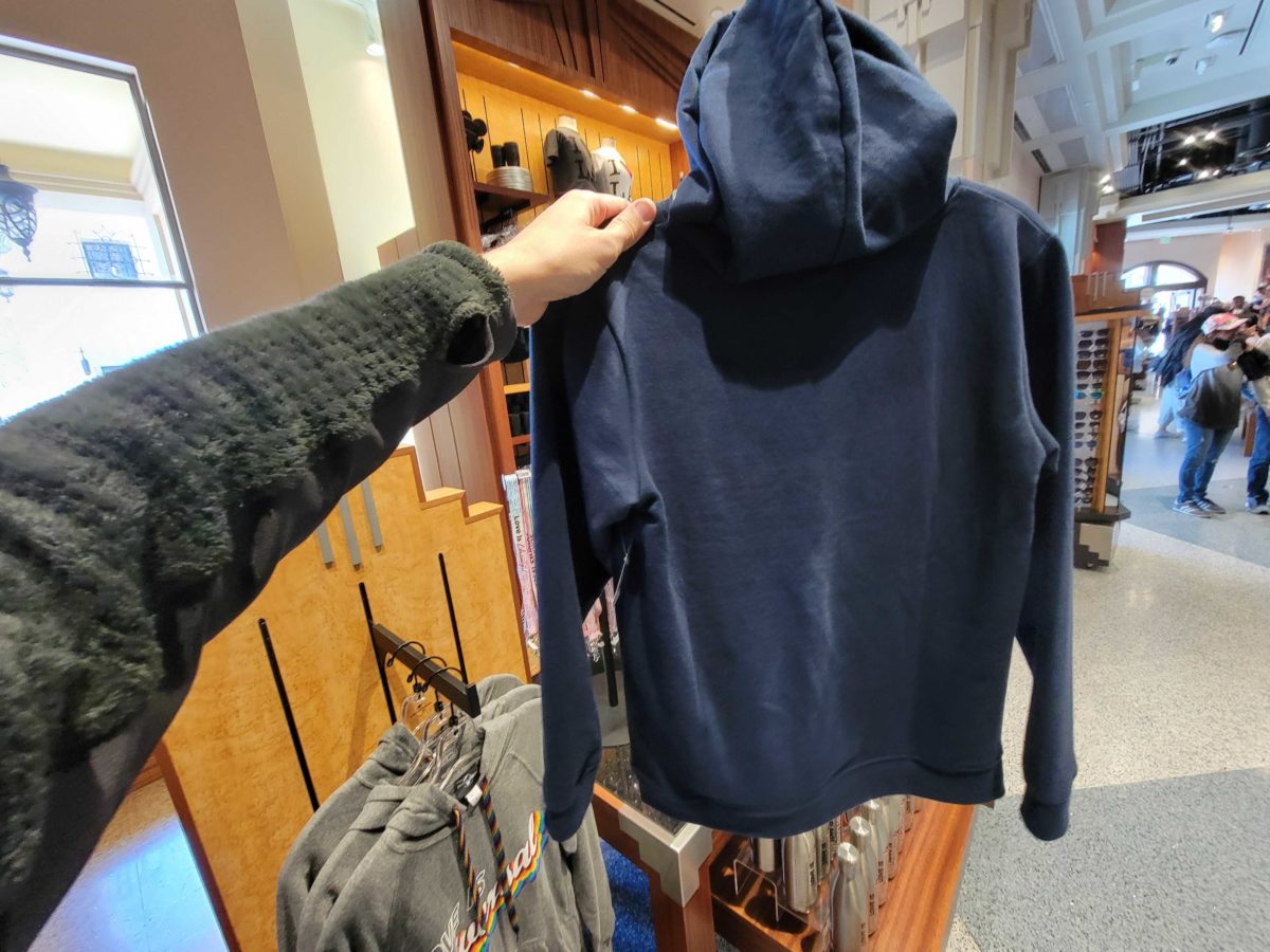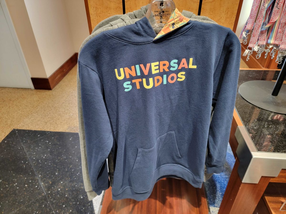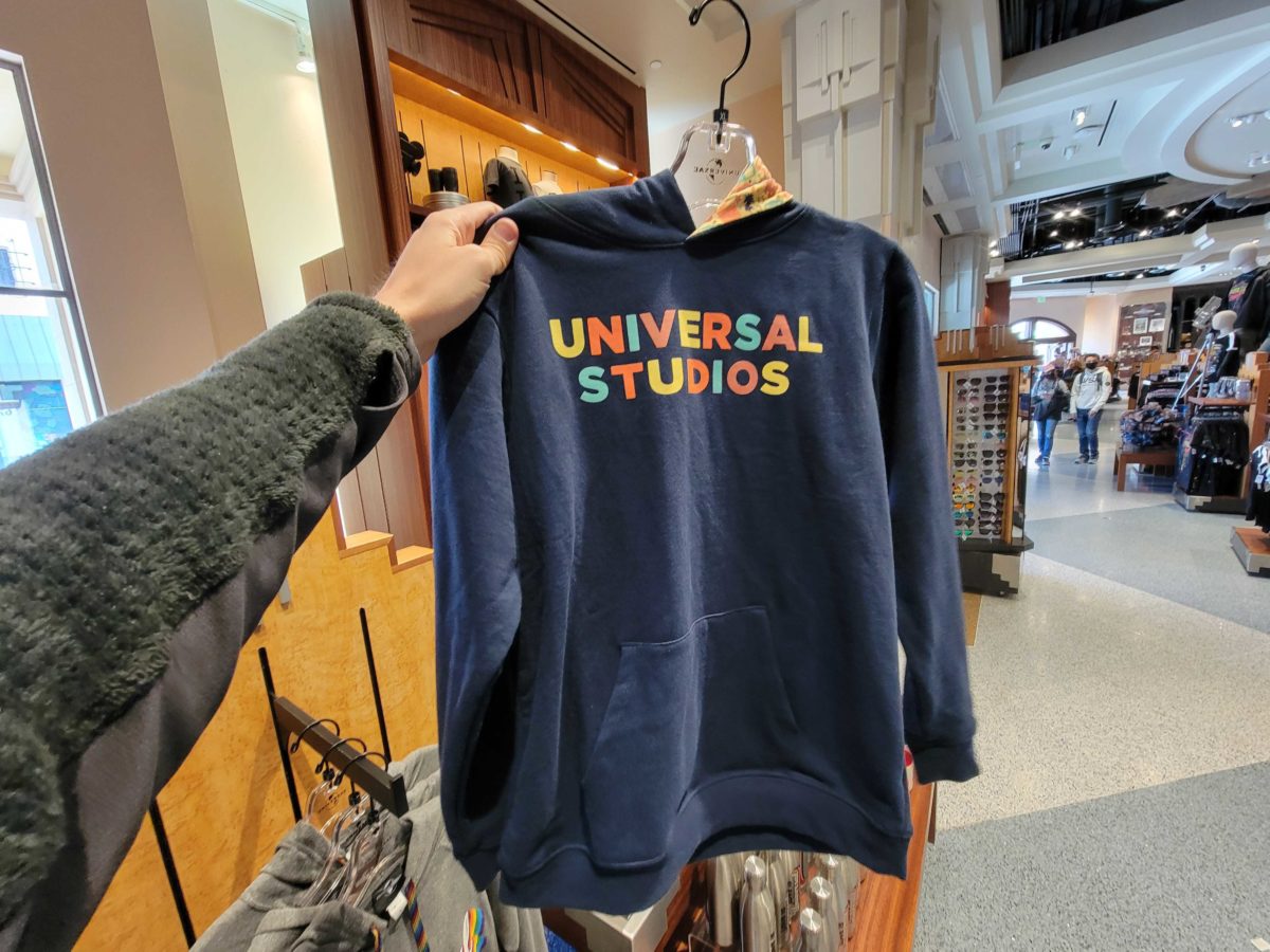 This dark blue pullover hoodie has “Universal Studios” printed across the front in colorful letters. There’s also a large front pocket.