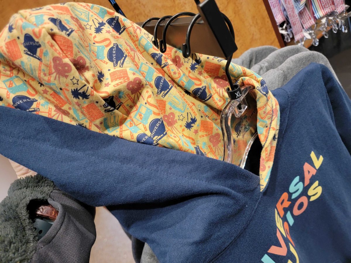There are no designs on the back of the hoodie, but you will find some colorful print on the interior. A brightly colored pattern featuring palm trees, the Universal entrance arch, movie cameras, and stars lines the hood of this sweatshirt.