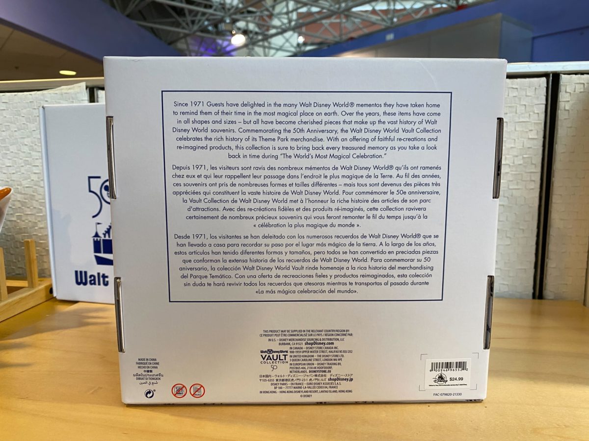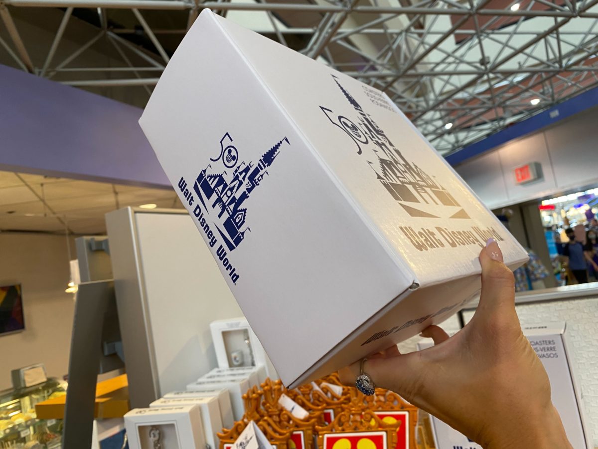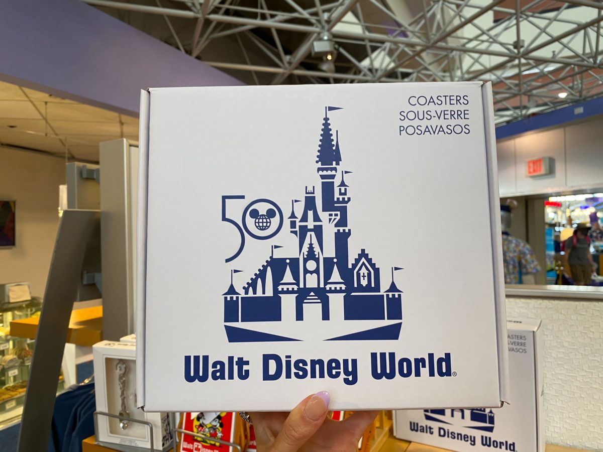 The box — decorated with the Vault Collection Cinderella Castle logo — is labeled as coasters, but they seem more like trays to us.
