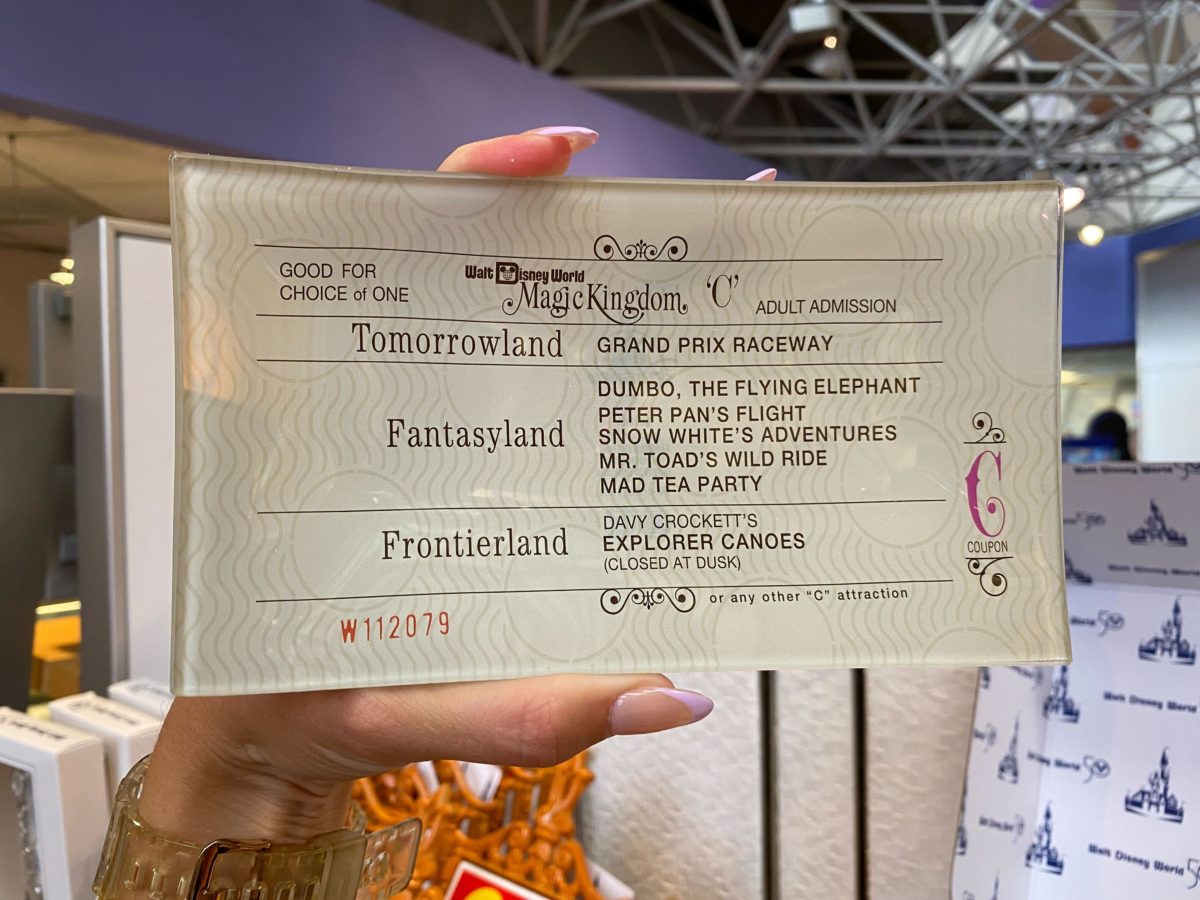 This white “C” ticket lists the Grand Prix Raceway (now known as the Tomorrowland Speedway), Dumbo the Flying Elephant, Peter Pan’s Flight, Snow White’s Adventures, Mr. Toad’s Wild Ride, Mad Tea Party, and Davy Crockett’s Explorer Canoes.