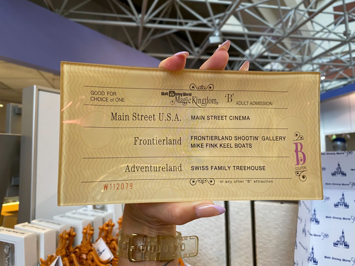 The off-white “B” ticket could be used for the Main Street Cinema (now a store housing the Vault Collection), Frontierland Shootin’ Gallery, Mike Fink Keel Boats, and Swiss Family Treehouse.