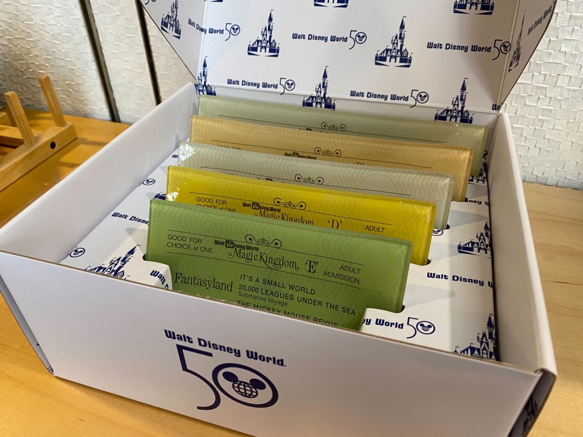 New trinket trays inspired by the old lettered tickets of Walt Disney World have joined the 50th anniversary Vault Collection. We first spotted these “coasters” in Bay View Gifts at Disney’s Contemporary Resort.