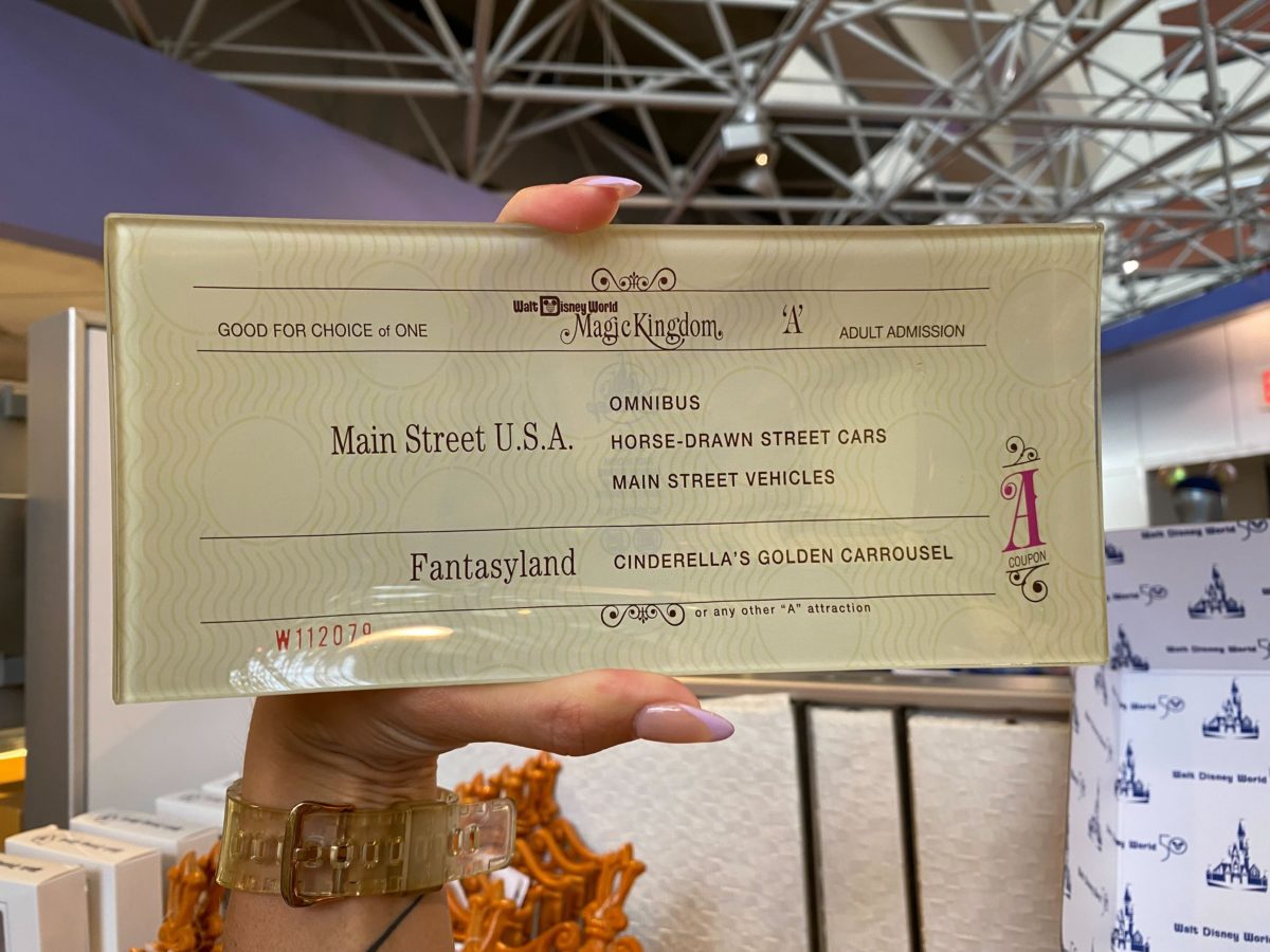 Finally, the “A” ticket was used for the omnibus, horse-drawn street cars, and other Main Street vehicles, as well as Cinderella’s Golden Carrousel (now the Prince Charming Regal Carrousel).