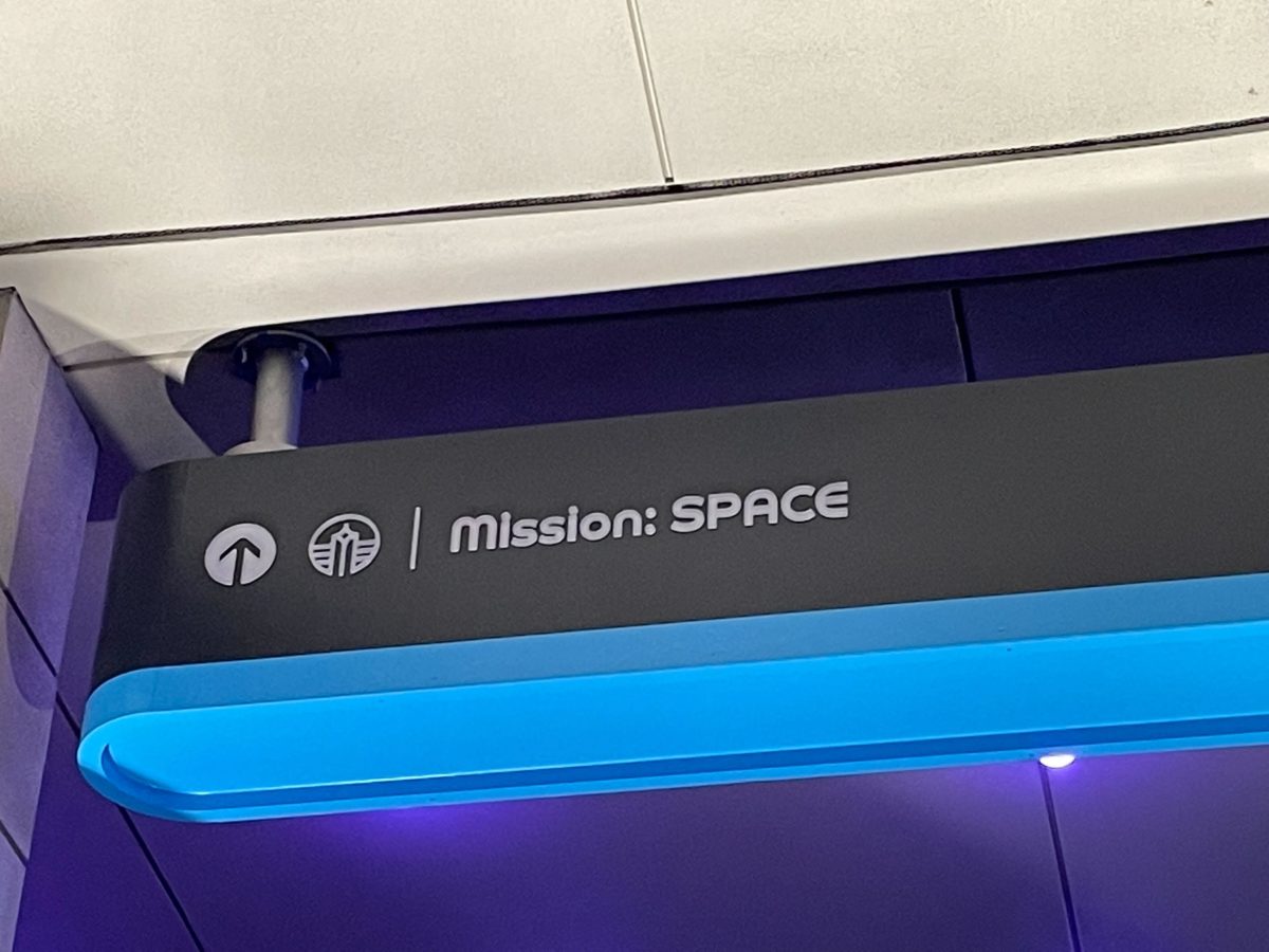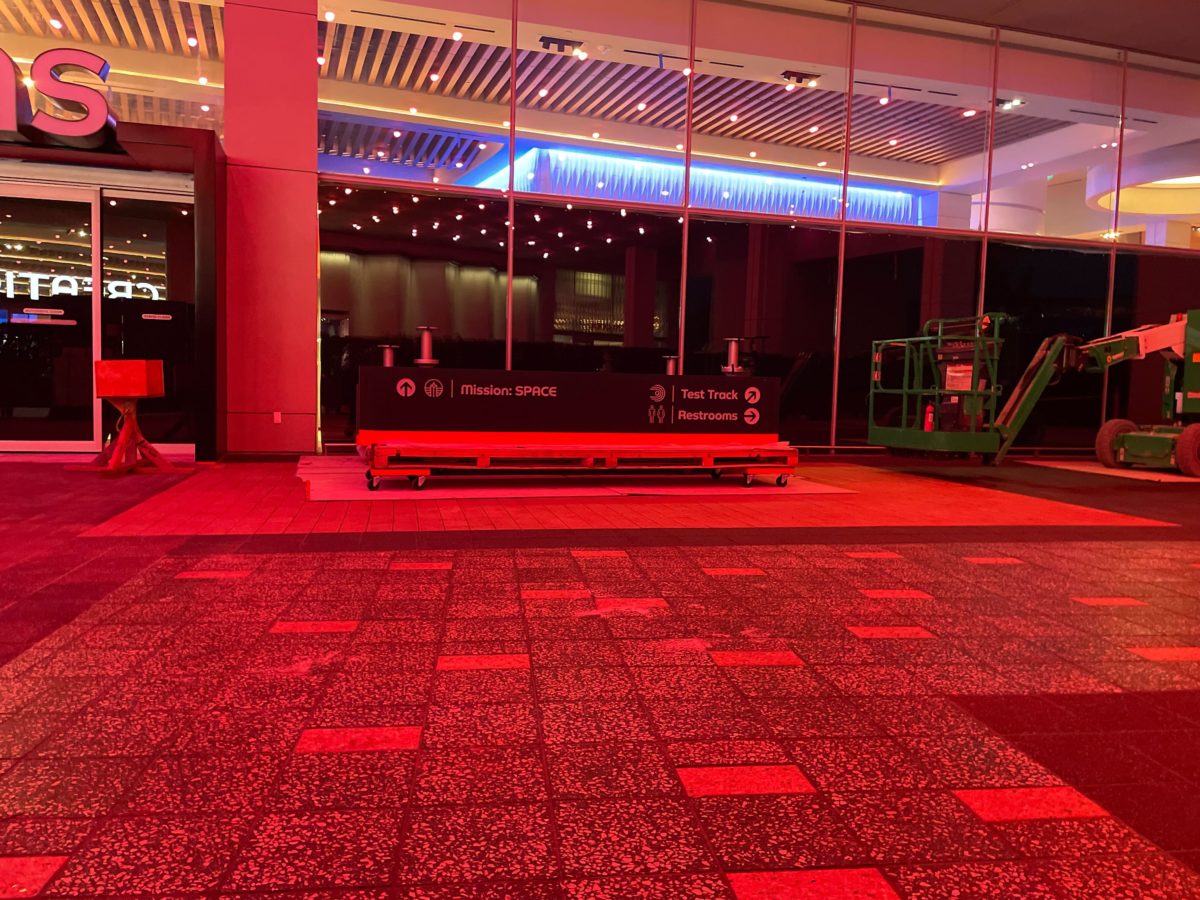Our eagle-eyed reporters spotted another sign outside Connections waiting to be installed. It is red since it will be hung on the World Discovery side and directs guests to Mission Space, Test Track, and nearby restrooms.