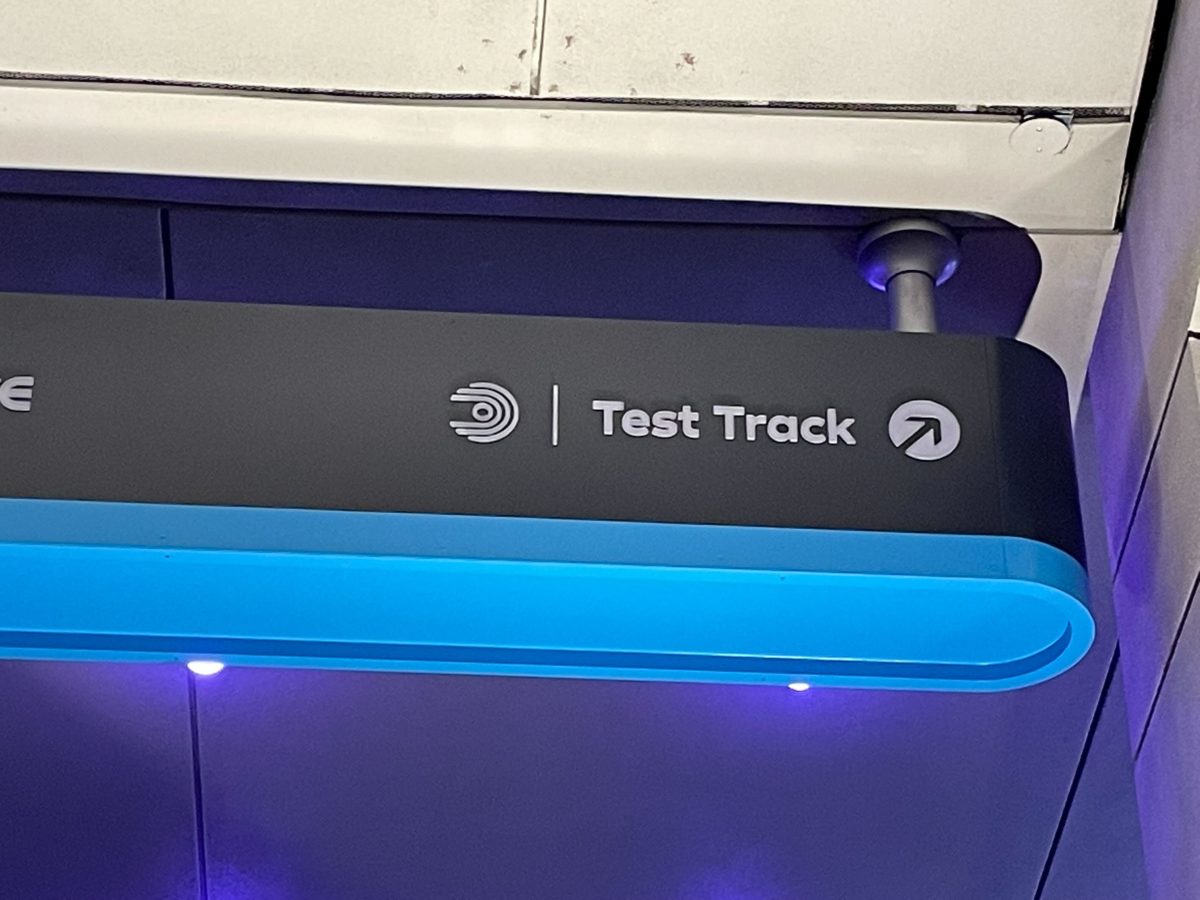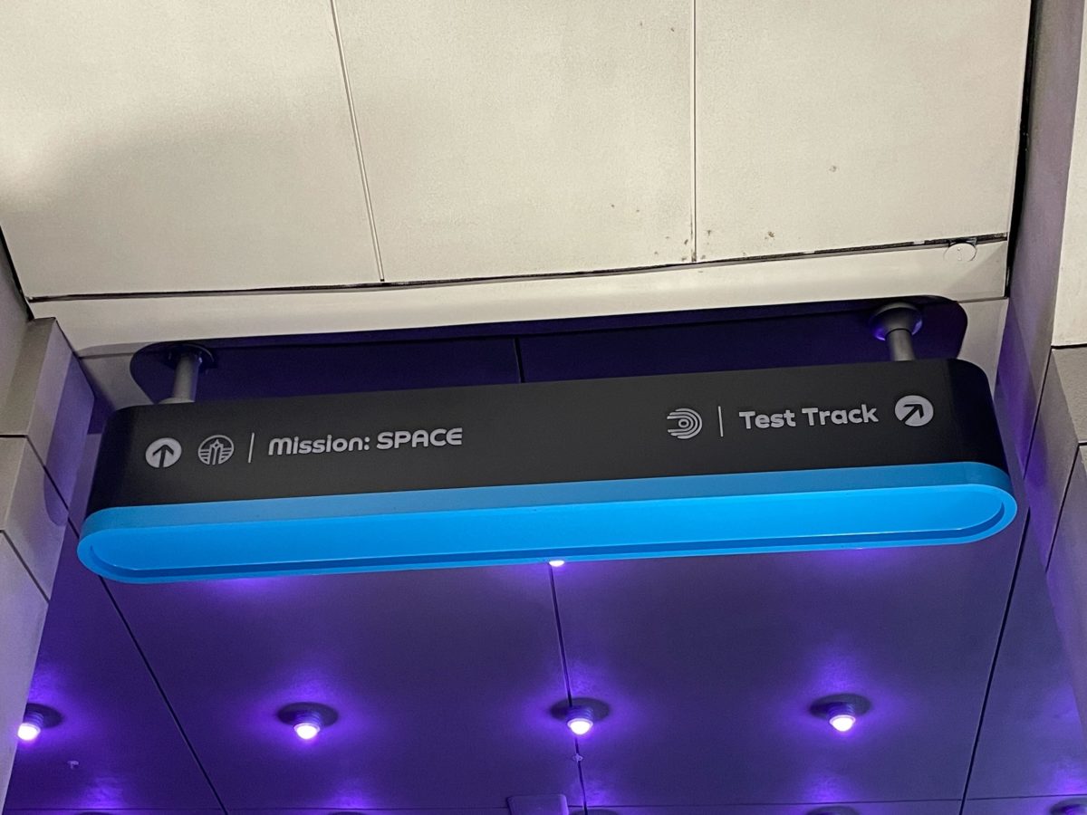 This sign directs guests to Test Track and Mission: Space, which are both in World Discovery.