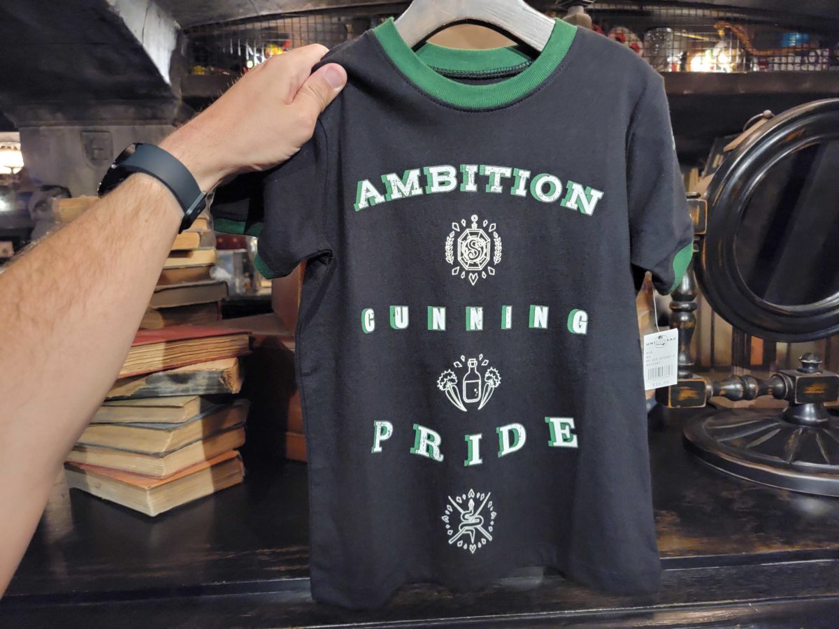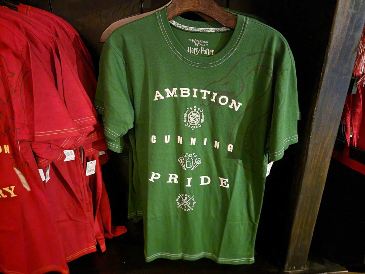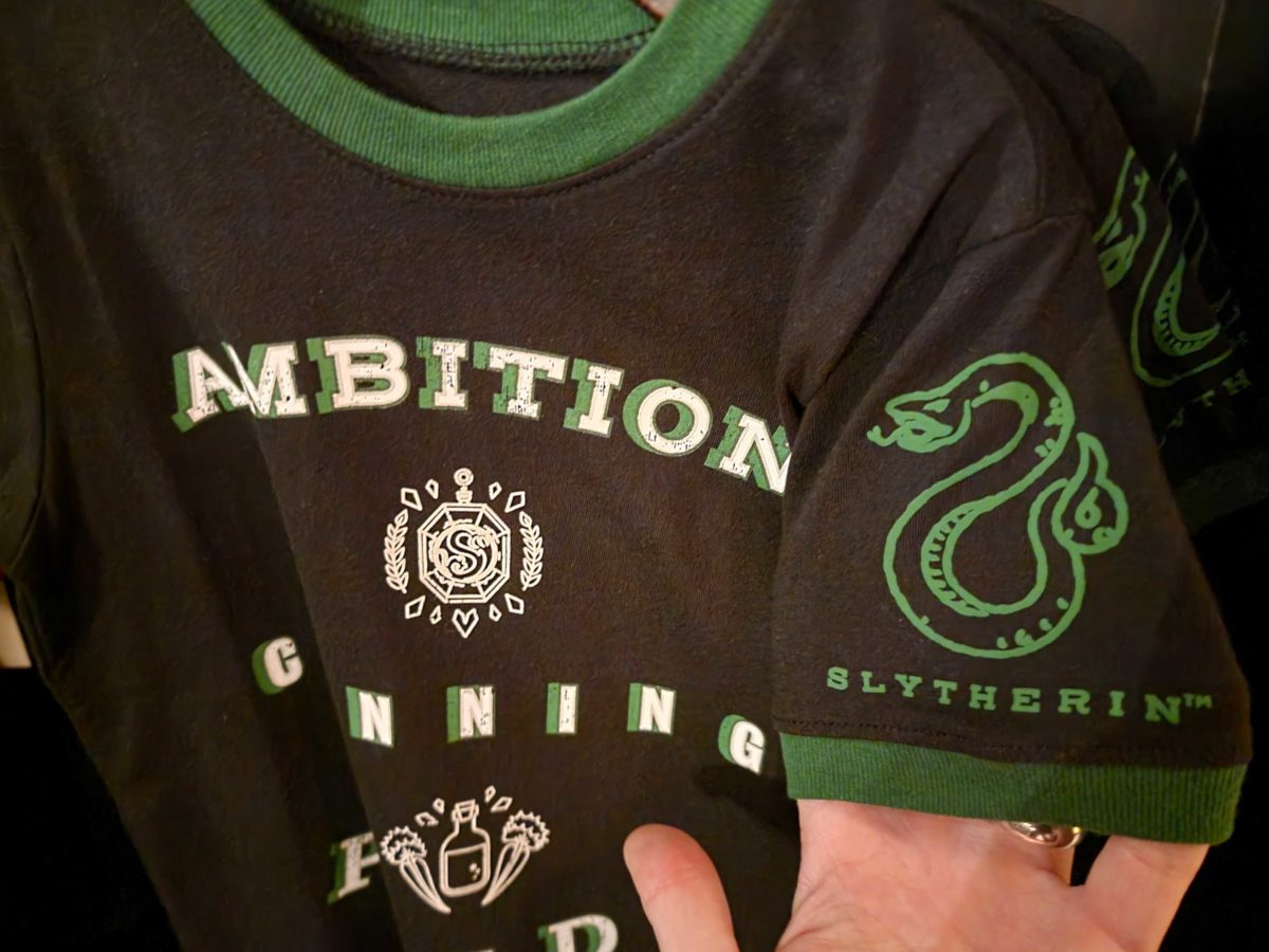 The Slytherin shirt is green and lists ambition, cunning, and pride in white. The images are of Slytherin’s locket, potion materials, and a snake. A larger snake is to the side.