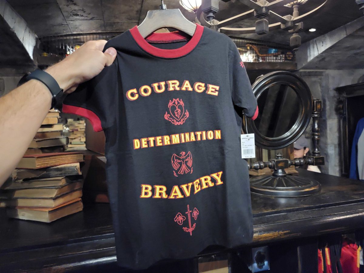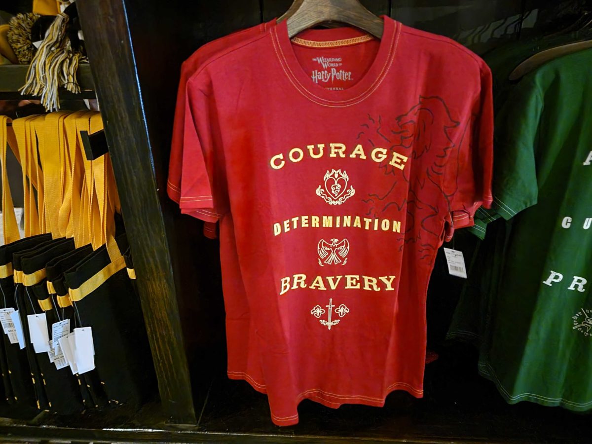 The adult tees are each the main color of the house and list three traits of the house. The Gryffindor shirt is red and lists courage, determination, and bravery in gold-yellow lettering. A flaming heart, Phoenix, and a sword are pictured between the words. The Gryffindor lion is outlined in black on the side.