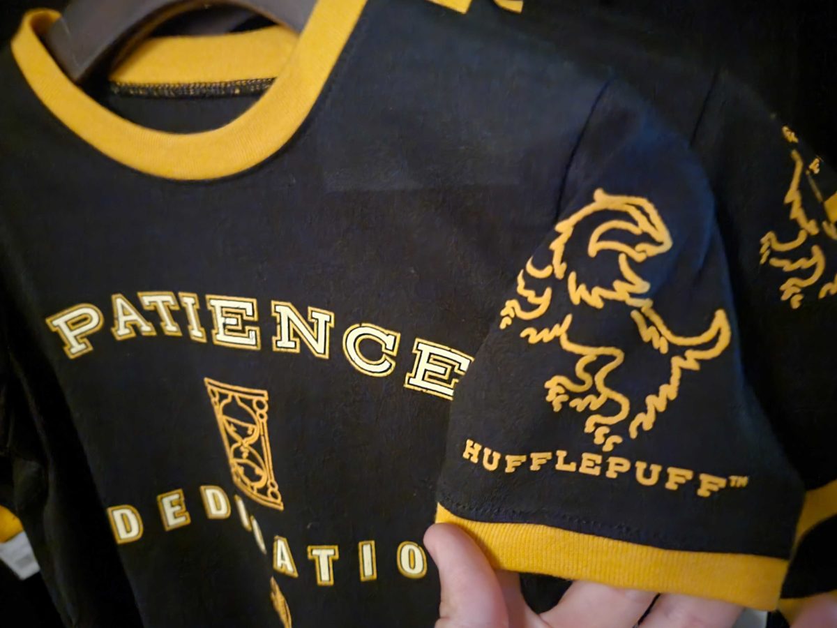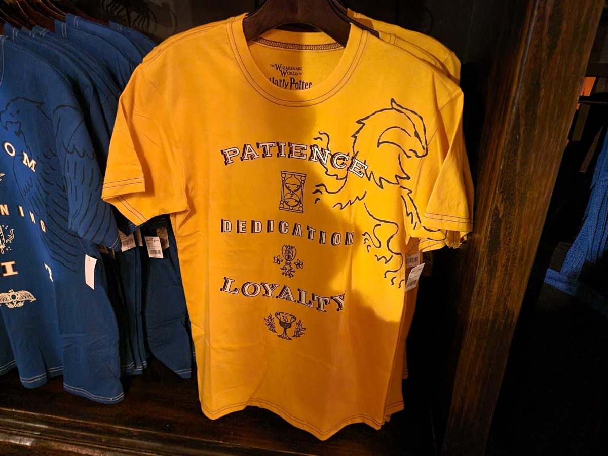 The Hufflepuff shirt is yellow with patience, dedication, and loyalty listed in white letters with black shadows. A badger is to the side, and the smaller images are an hourglass, mandrake, and Hufflepuff’s goblet.