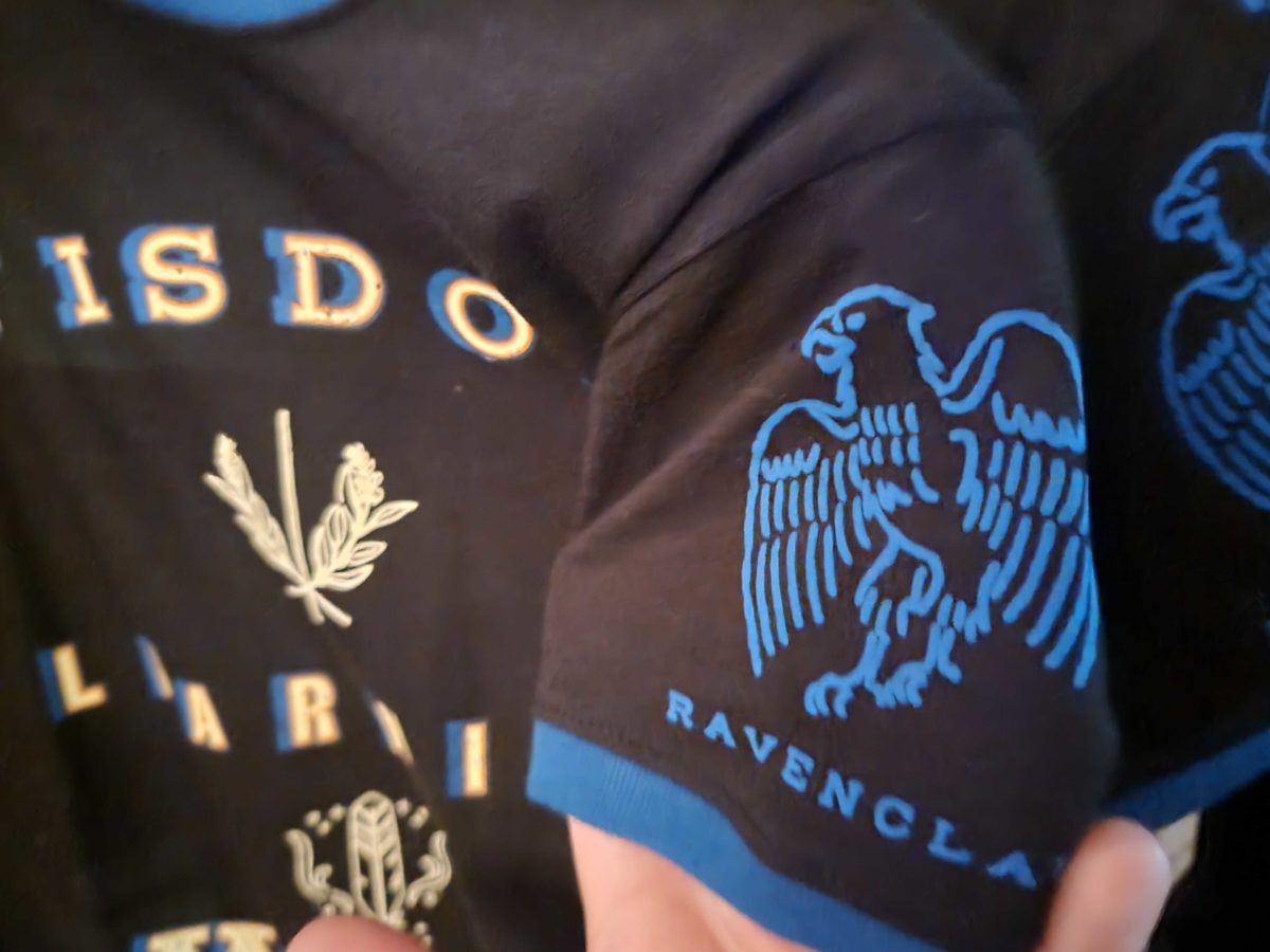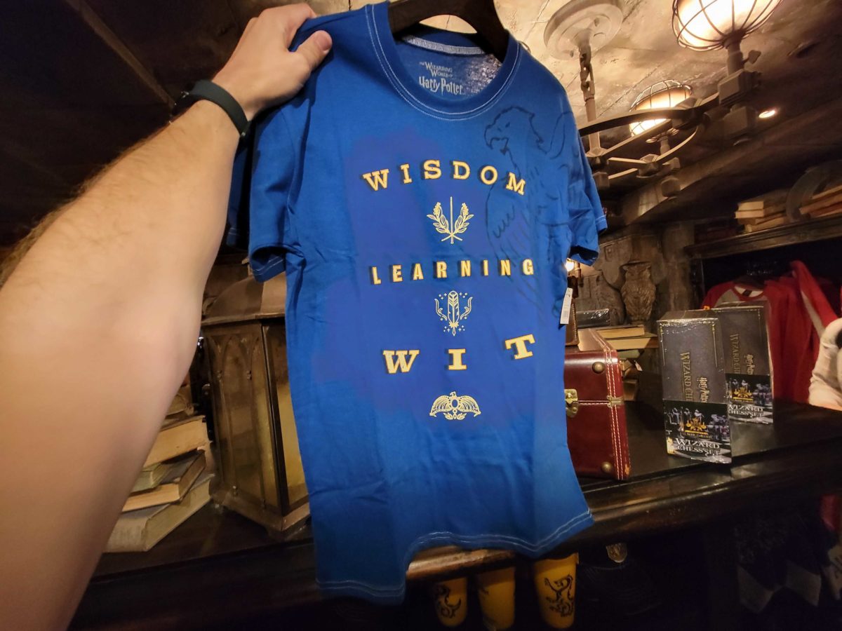 The Ravenclaw shirt is blue with yellow lettering, reading wisdom, learning, and wit. A bird is outlined in black to the side. The smaller images are feathers and a wand, a quill, and Ravenclaw’s diadem.