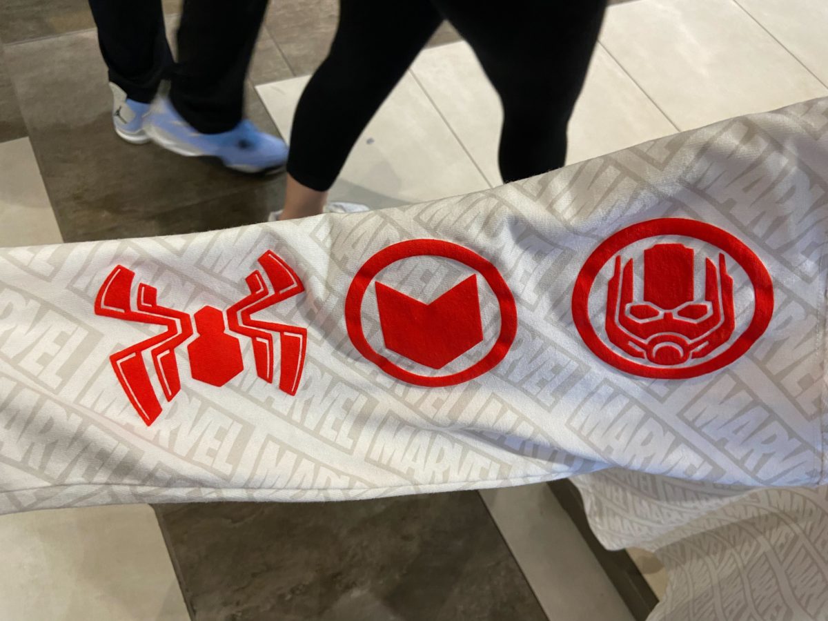 Bright red symbols for multiple Marvel characters are embossed throughout the jersey. Symbols for Spider-Man, Hawkeye, and Ant-Man are on the left sleeve.