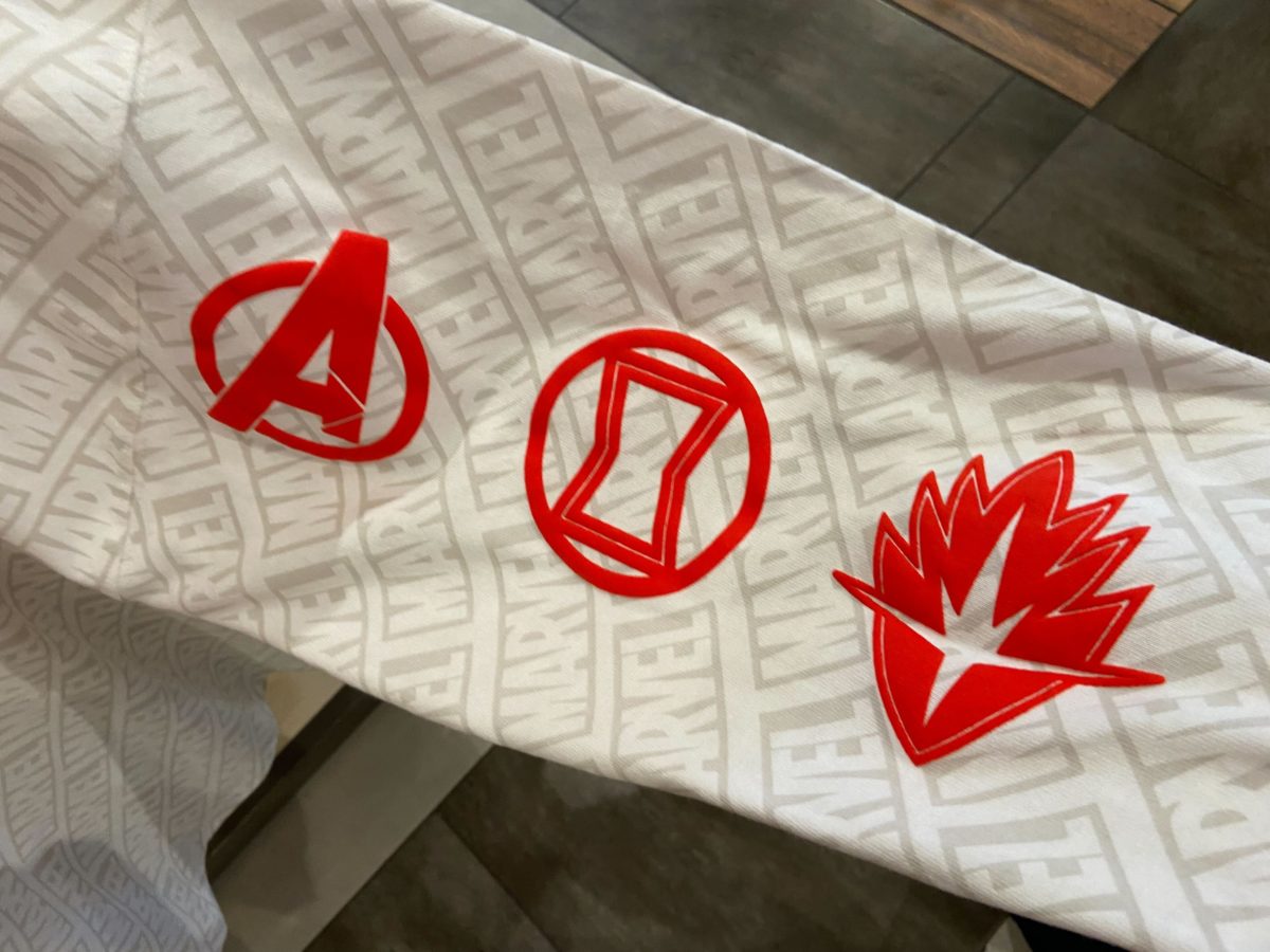 On the back of the jersey, the large red Marvel logo is across the shoulders, along with the rest of the Avengers symbols including Black Panther, Iron Man, Captain Marvel, and more.