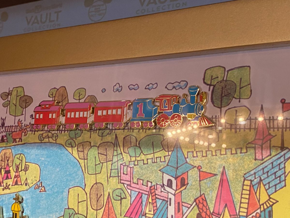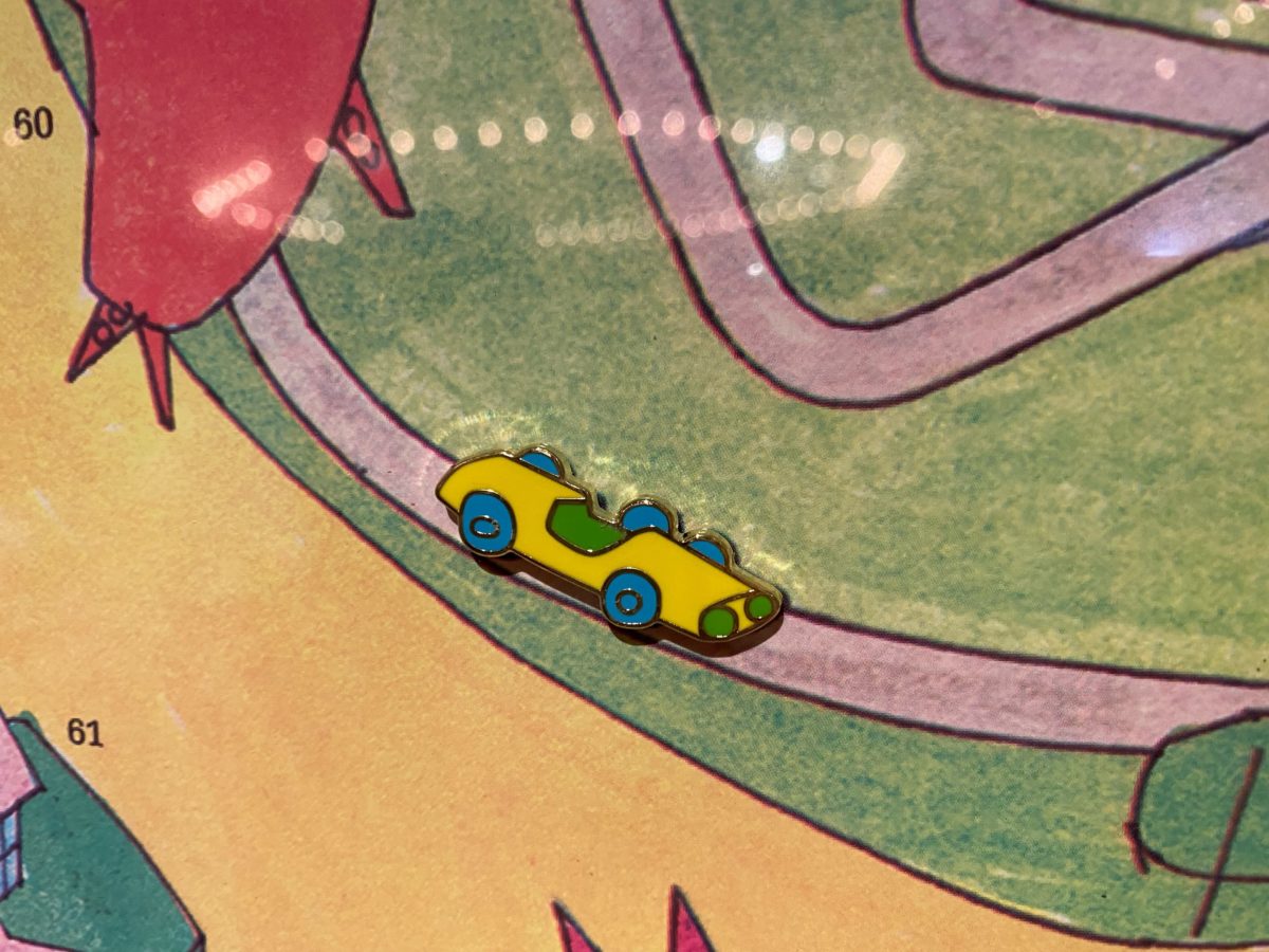 A tiny yellow Tomorrowland Speedway (or Grand Prix Raceway) car is a pin.