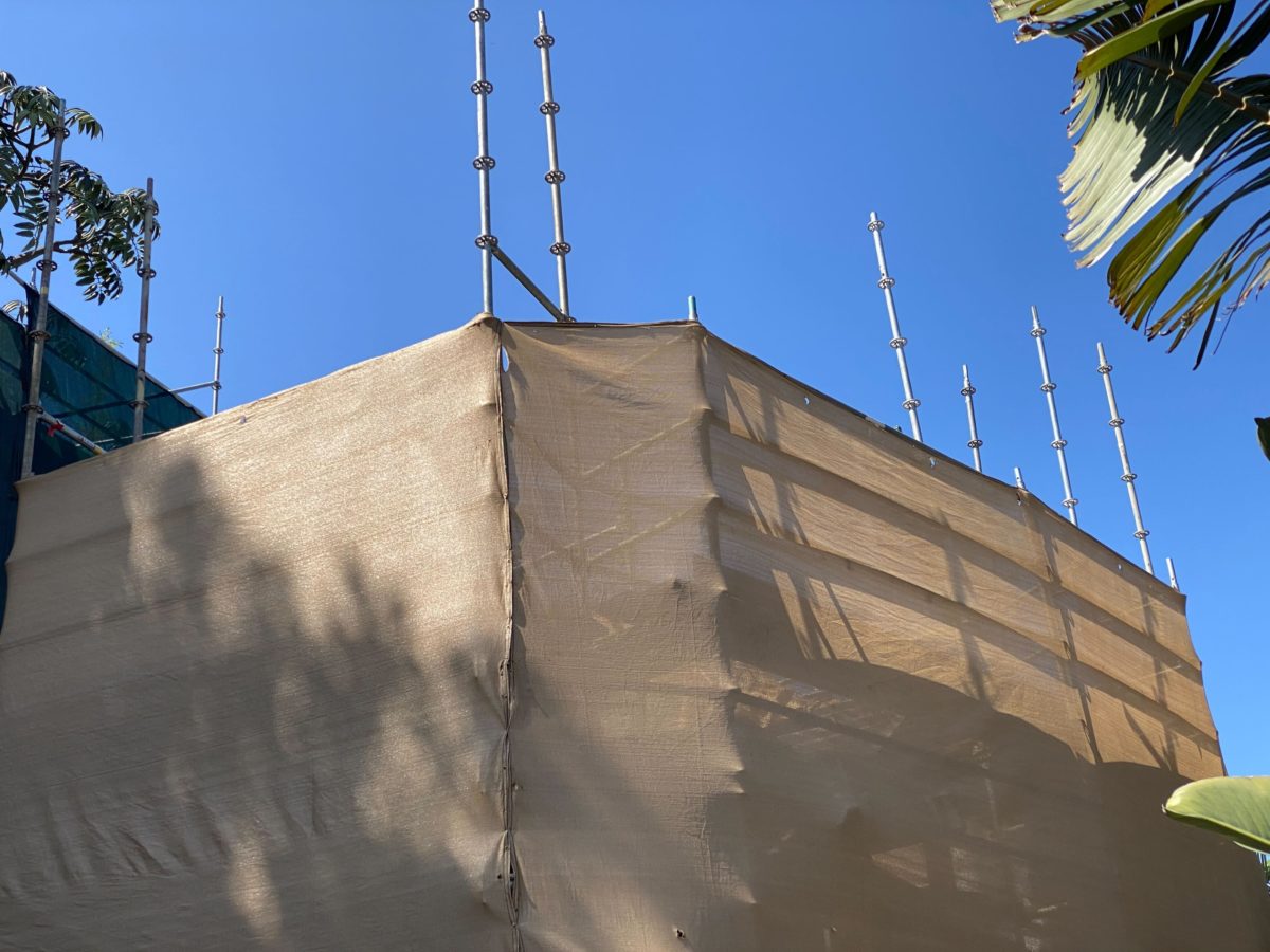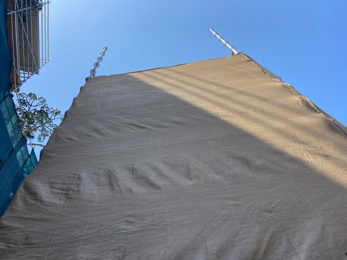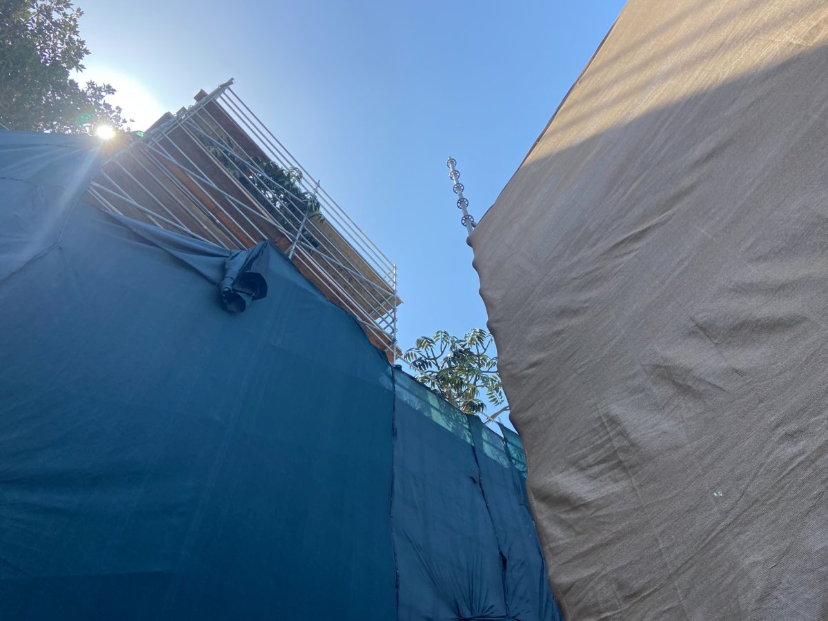 Passing between the two sections, we can see where the bridge used to be, now covered up by scrim.