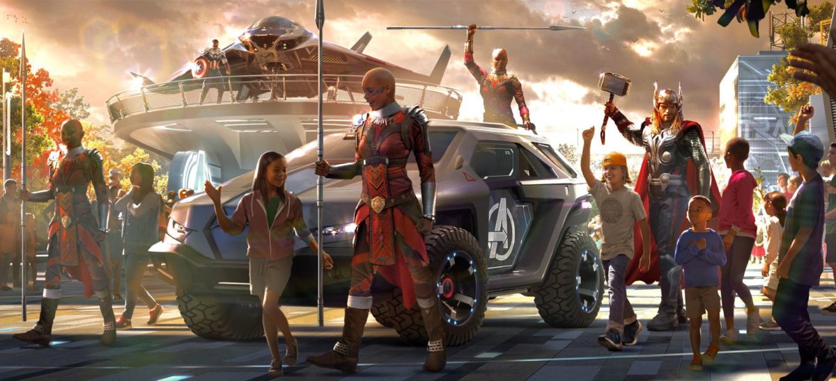 The final piece of concept art showcases heroes walking around Avengers Campus. Sam Wilson’s Captain America is visible on the Quinjet platform. We also saw Wilson in concept art released earlier this week. Thor and the Dora Milaje walk with children on the ground around the Avengers Deployment Vehicle (ADV), which will transport characters.