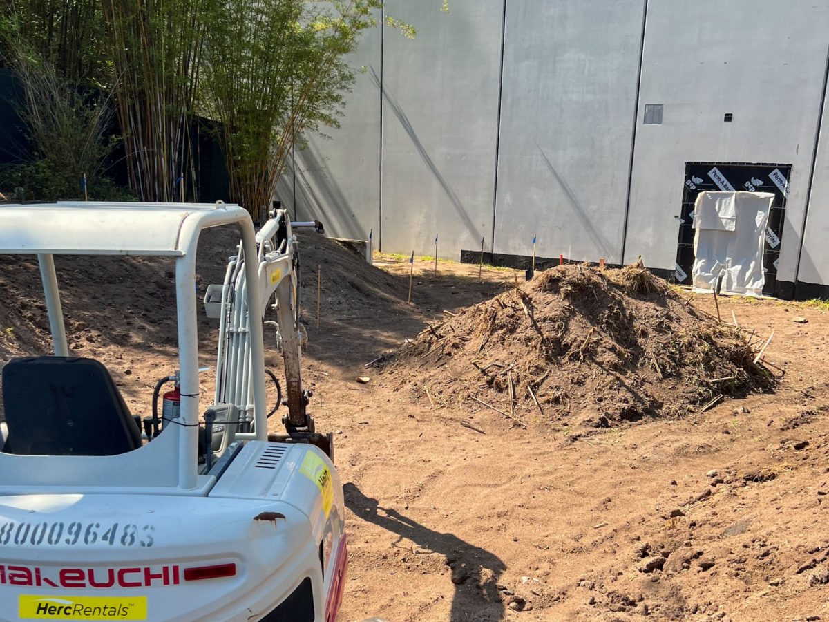 There was previously grass on this land but it’s now just dirt. An excavator vehicle is parked behind the walls.