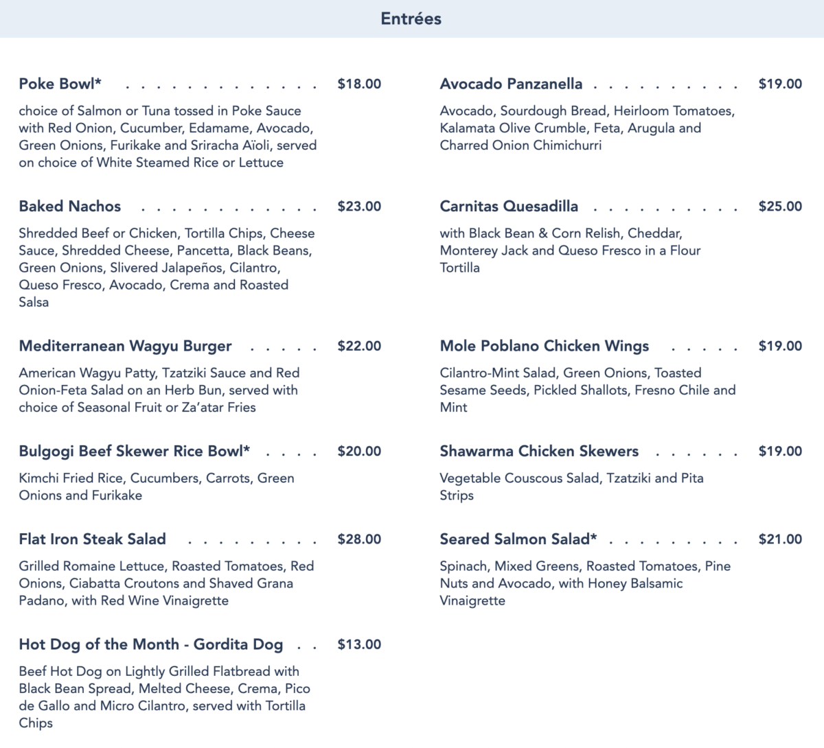 The Black Angus Flat Iron Steak Salad is now just listed as the Flat Iron Steak Salad for $28. The Poke Bowl is now $18 instead of $17. The Double-baked Nachos are now just Baked Nachos, still for $23. The classic sundae is now $10 instead of $8.