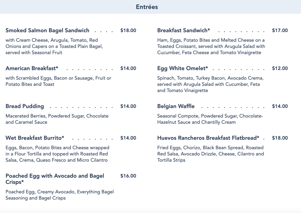 The smoked salmon bagel sandwich is now $18 instead of $17. The Belgian waffle is now $14 instead of $13. The grab ‘n’ go caesar salad is now listed as specifically a chicken caesar salad.