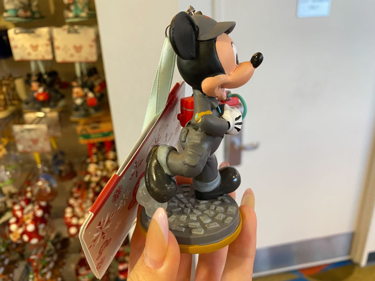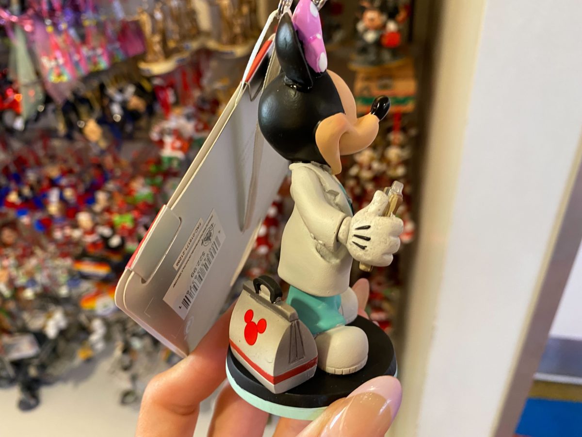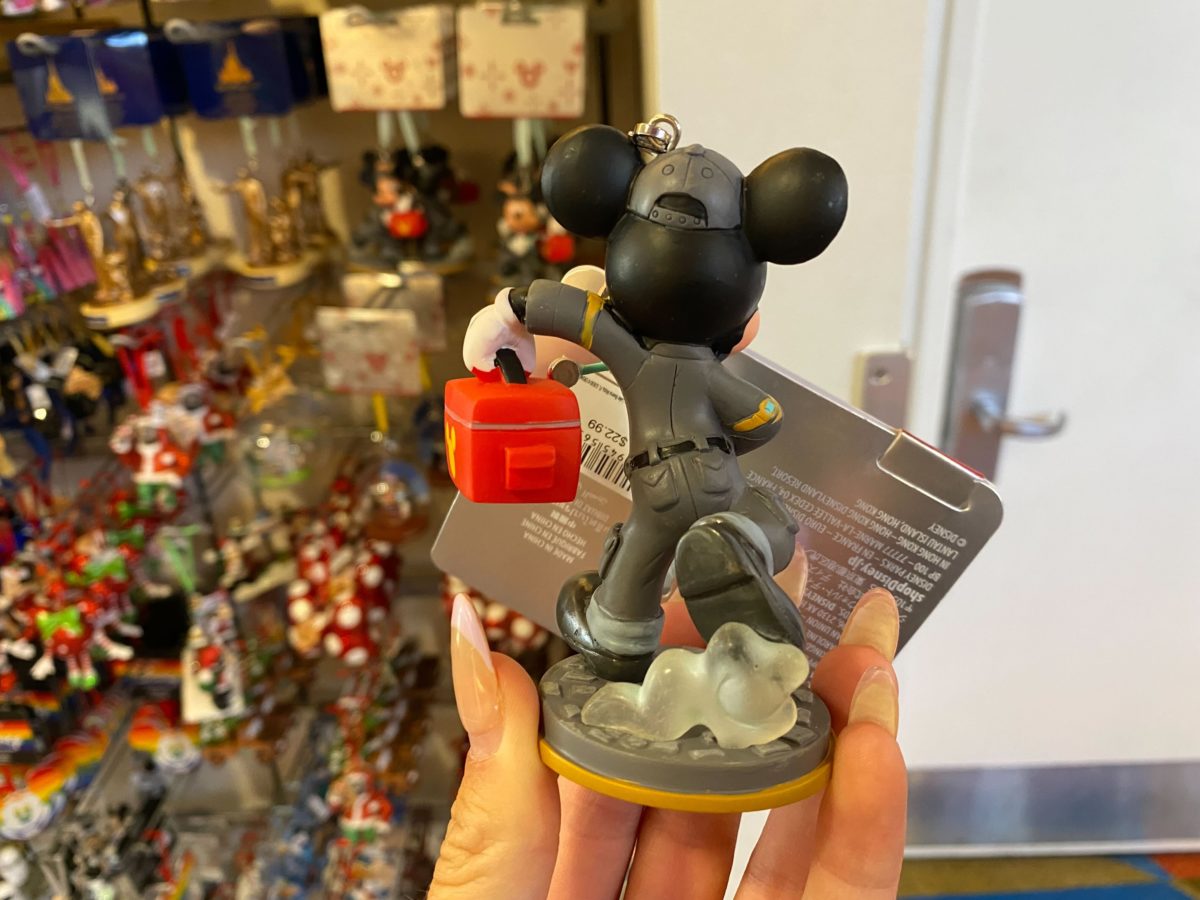 Mickey is dressed as an EMT on this ornament, wearing a grey jumpsuit.