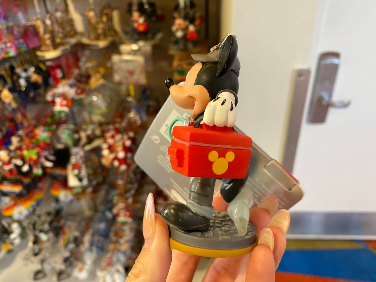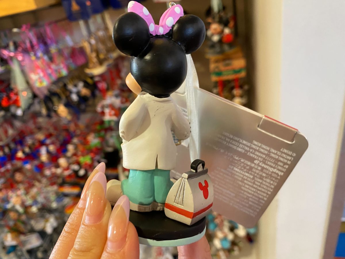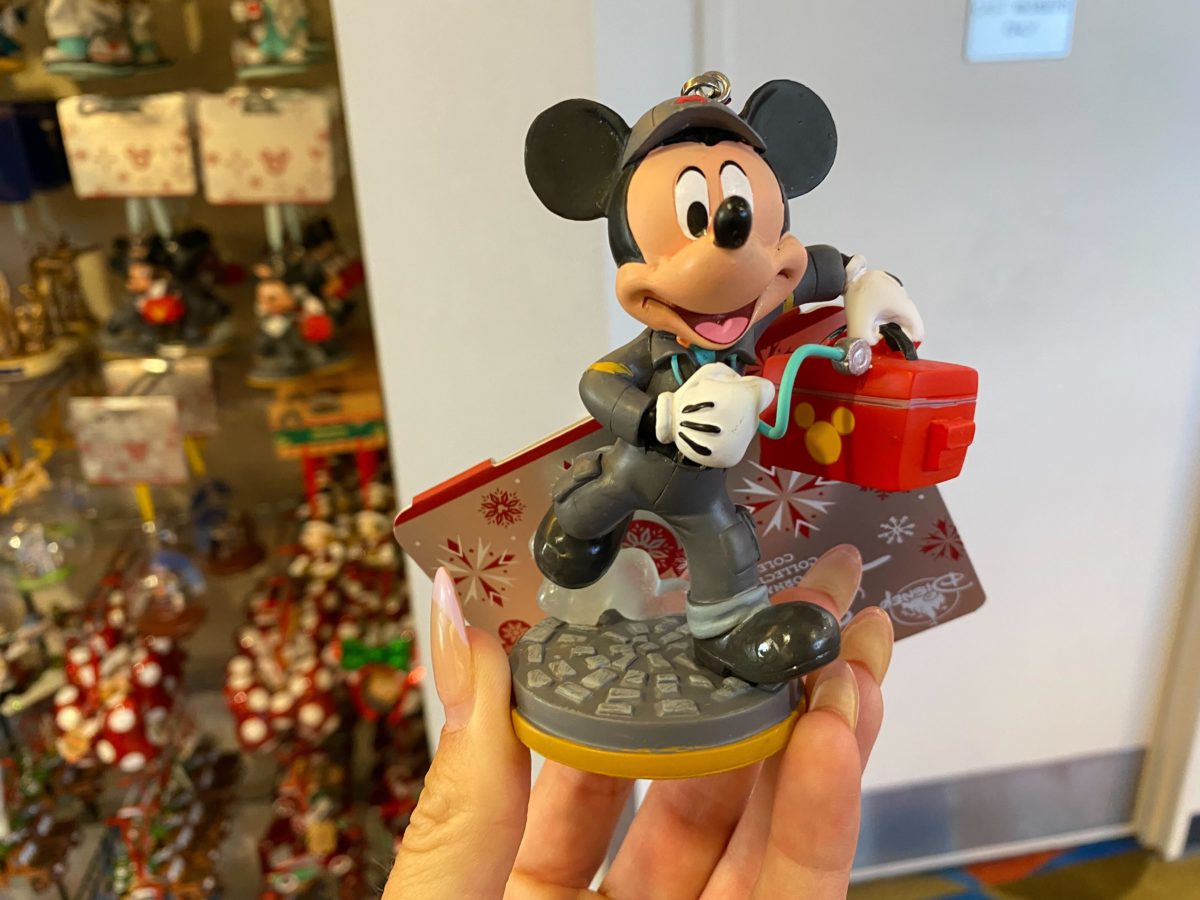 Mickey is dressed as an EMT on this ornament, wearing a grey jumpsuit.