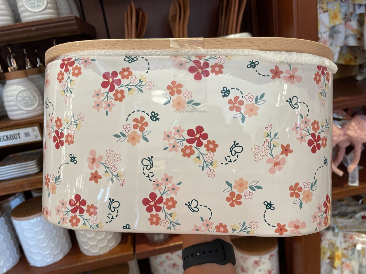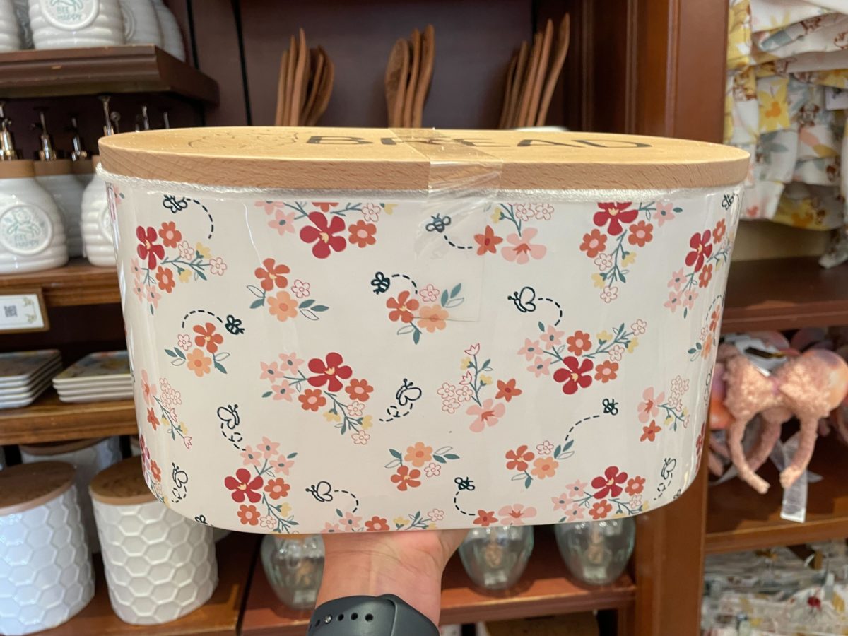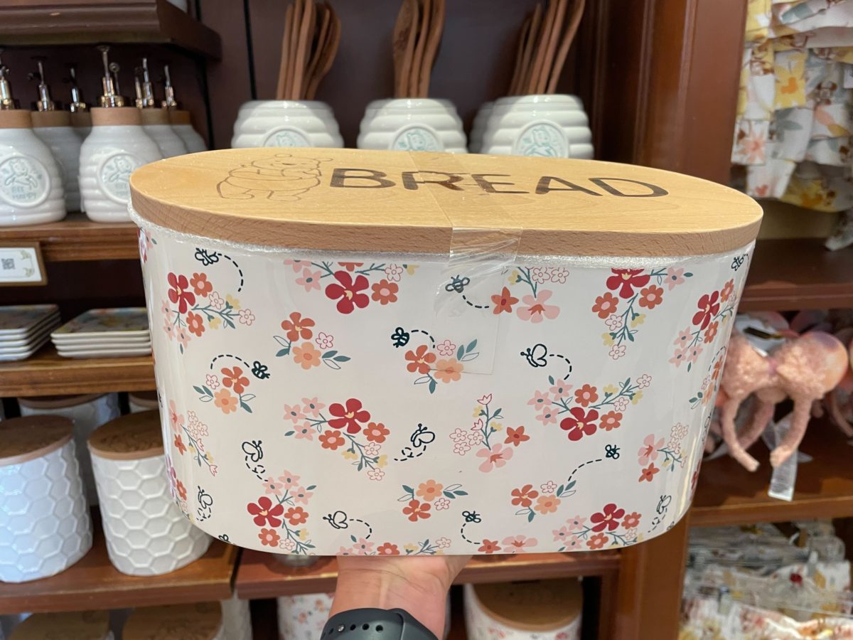 This matching bread box has Pooh bear and “Bread” on the wooden lid.