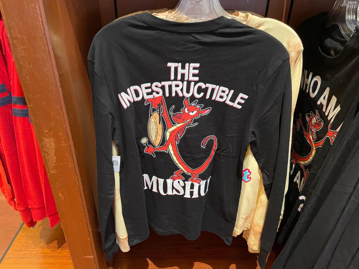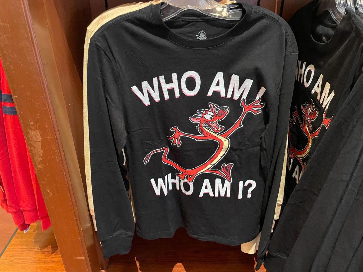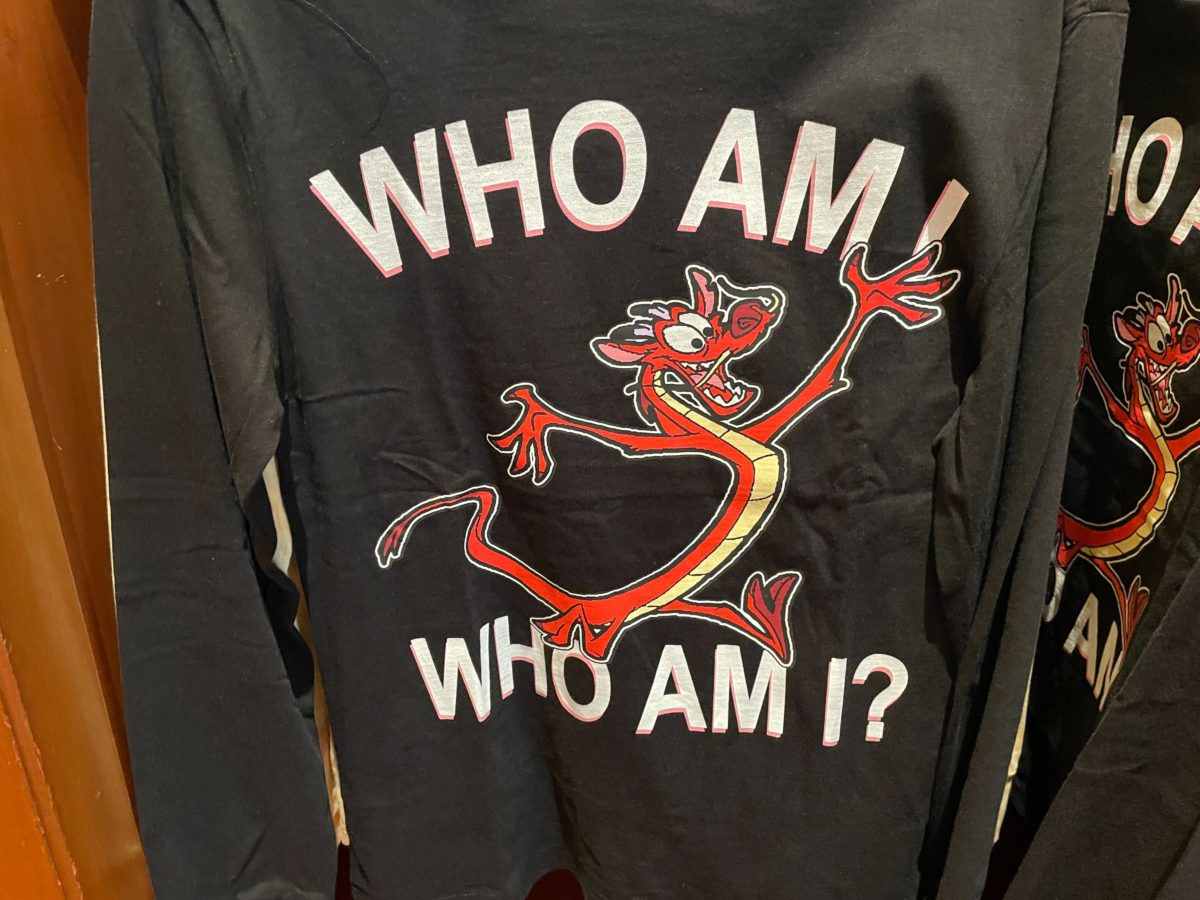 This shirt is black and says “Who am I?” twice on the front, around Mushu from “Mulan.”