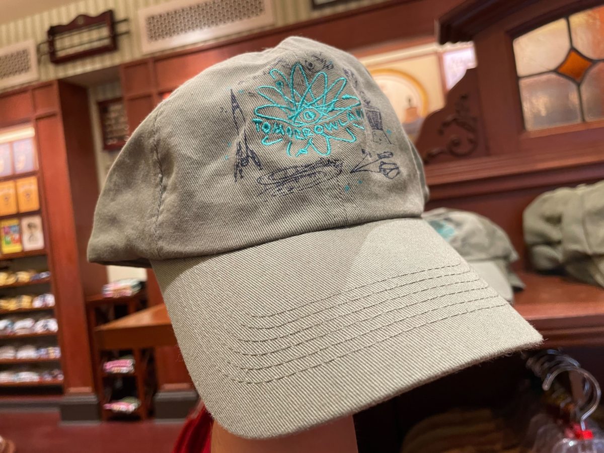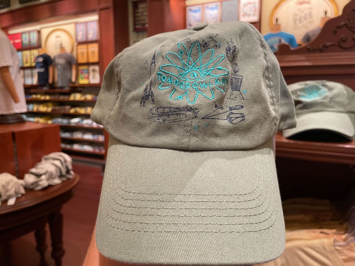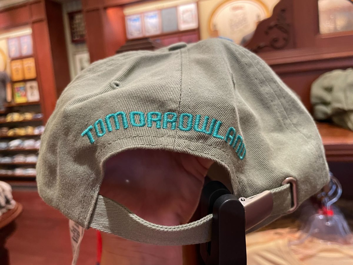 This army green cap has a blue atom embroidered on the front with “Tomorrowland” across it.
