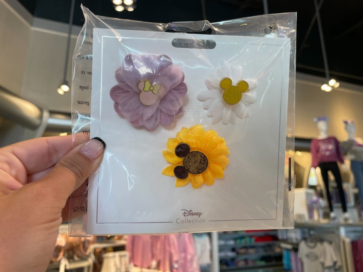There is a purple flower with a Minnie head at the center, white flower with a gold Mickey at the center, and yellow flower with a black Mickey at the center.