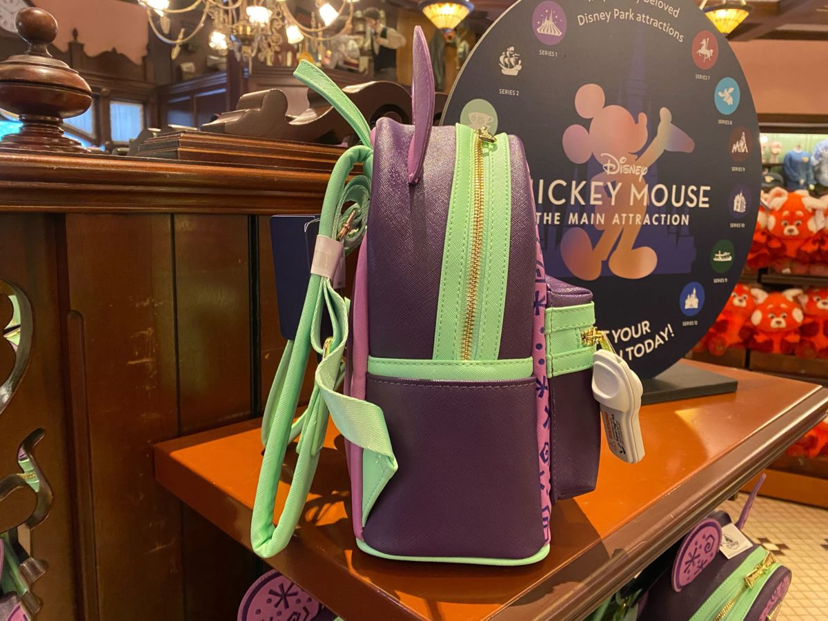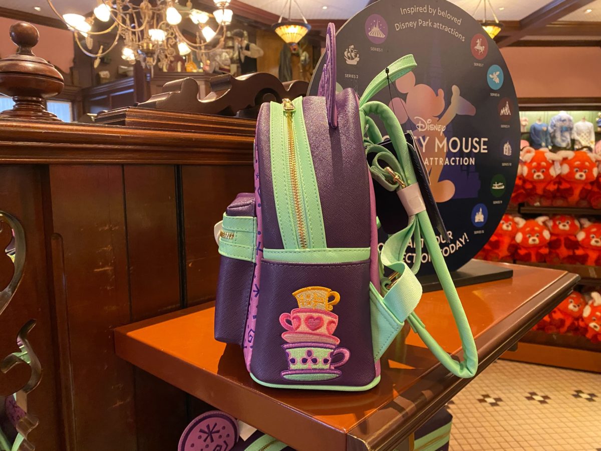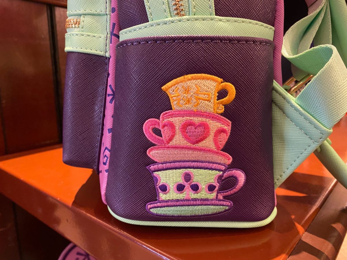 The side pocket features a stack of teacups that resemble the attraction’s vehicles embroidered onto the leathery fabric.