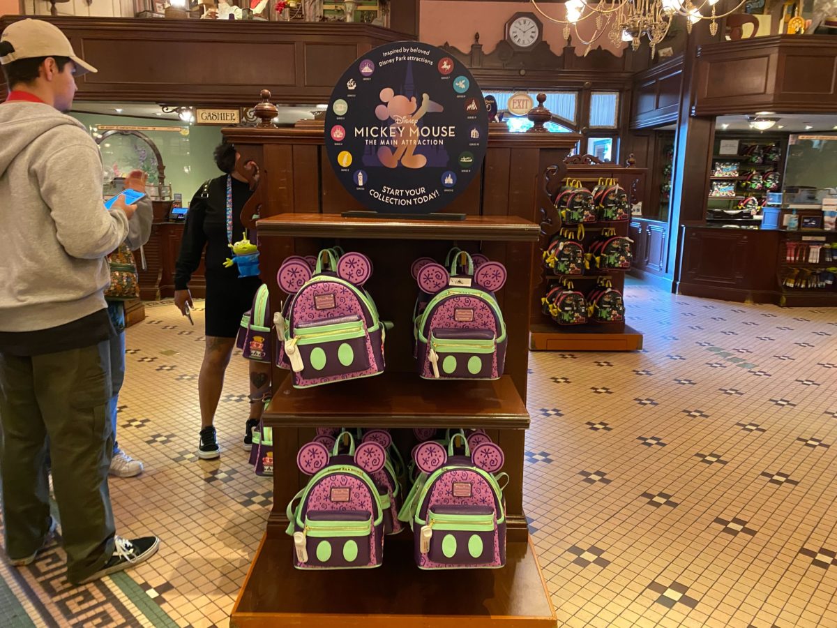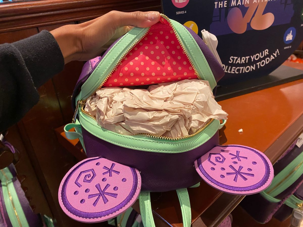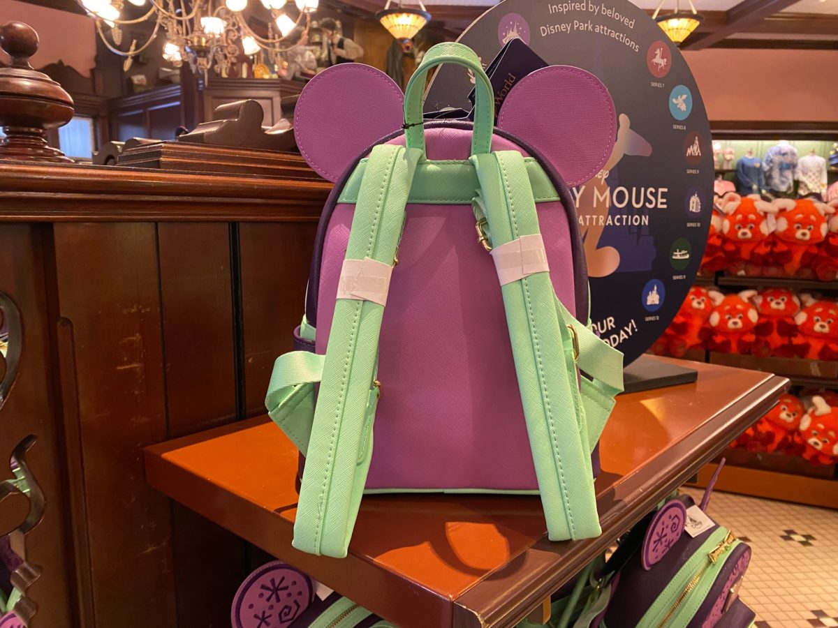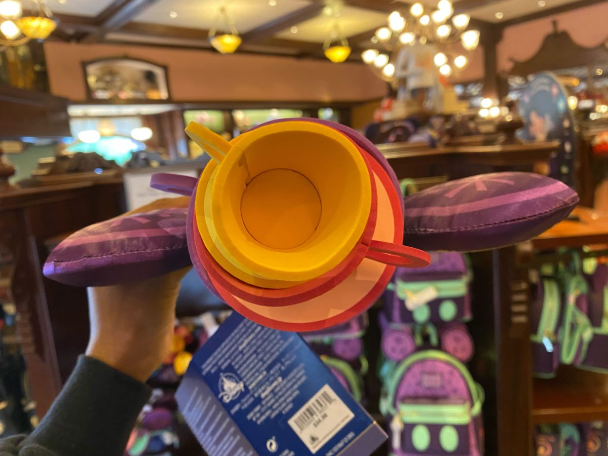 The side pocket features a stack of teacups that resemble the attraction’s vehicles embroidered onto the leathery fabric.