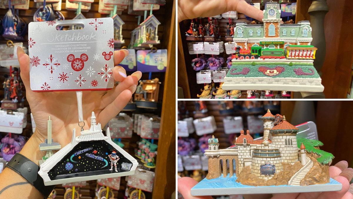 Three new split-building Sketchbook ornaments have arrived at Walt Disney World. These ornaments are inspired by iconic Walt Disney World buildings but feature them split open to show a scene from inside. The new ones are inspired by Space Mountain, the Main Street train station, and Under the Sea ~ Journey of the Little Mermaid.