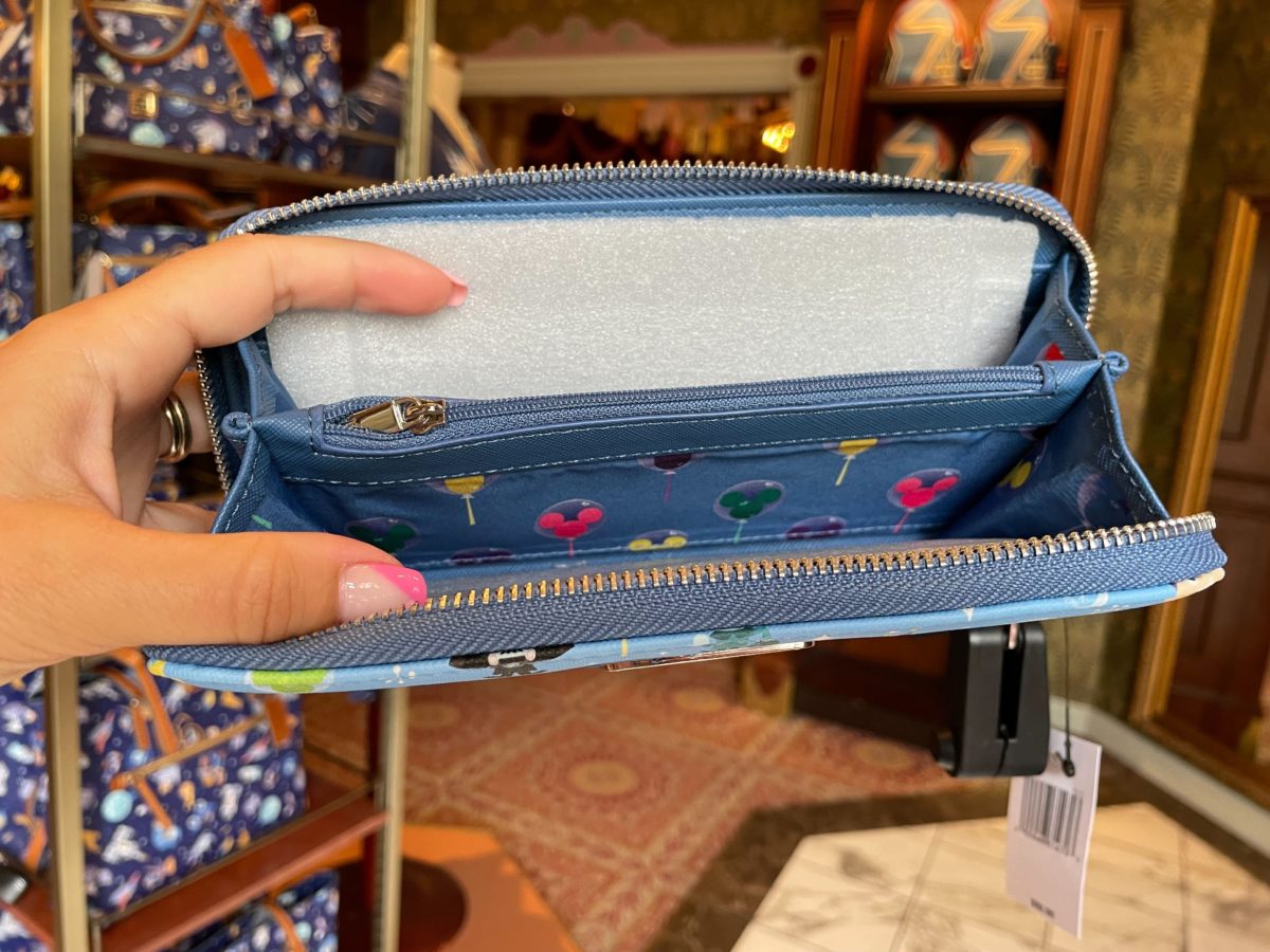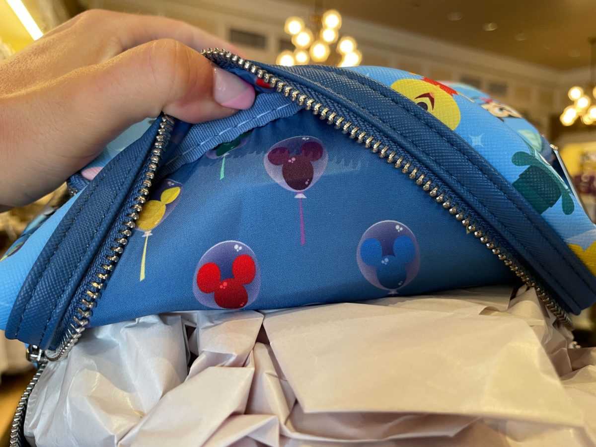The interior fabric is dark blue and patterned with just the colorful Mickey balloons.