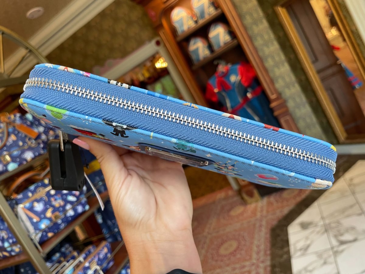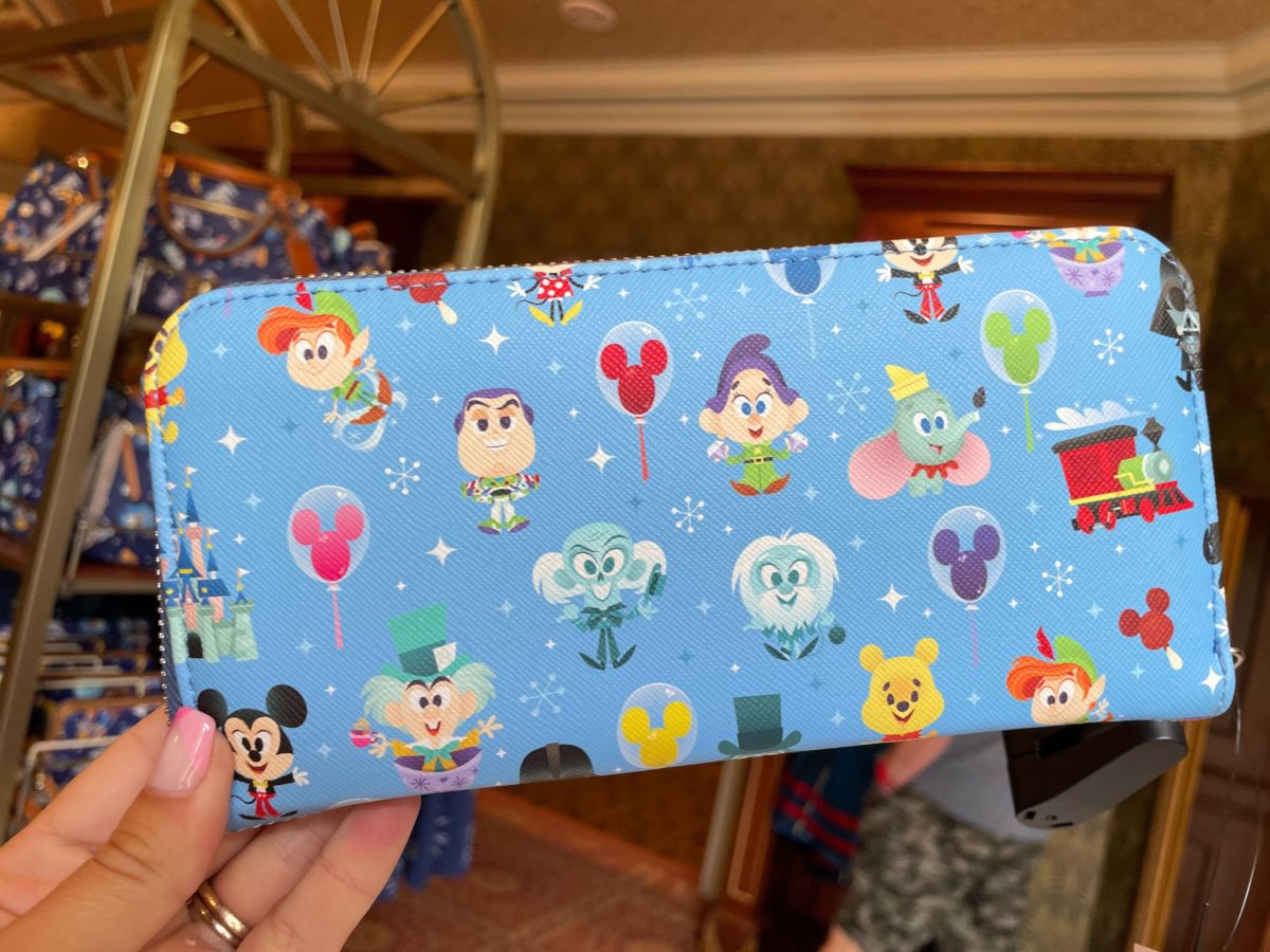 The wallet features the same pattern. Other characters you might spot are Mickey, Minnie, Buzz Lightyear, and the Mad Hatter (in a teacup).