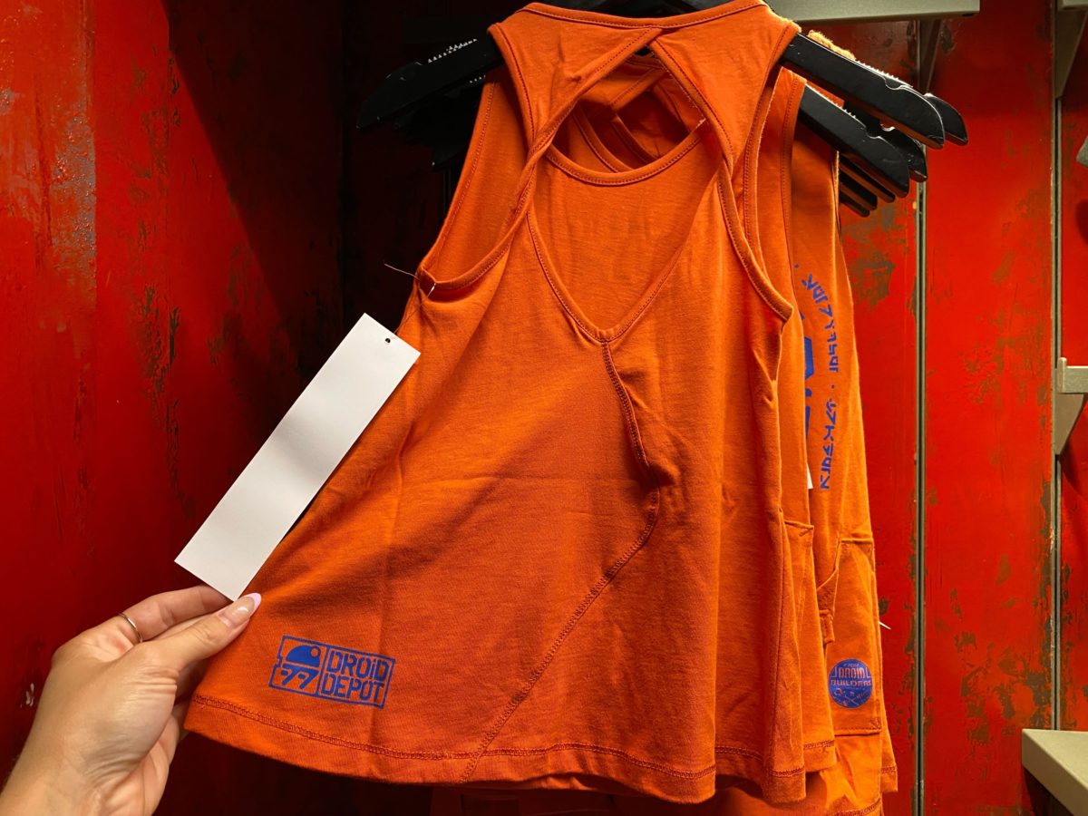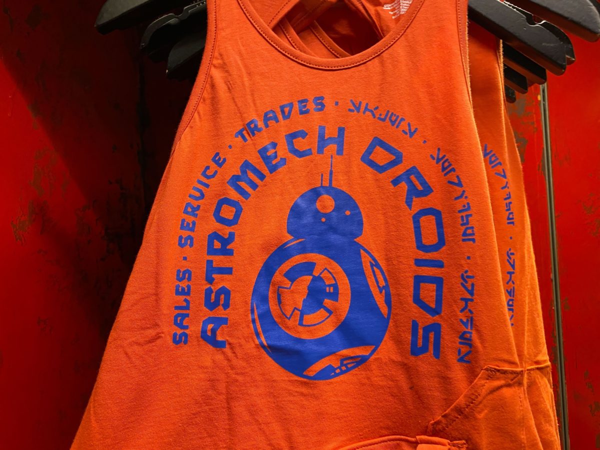 This orange tank top reads “astromech droids” in blue lettering around the image of a blue BB unit.