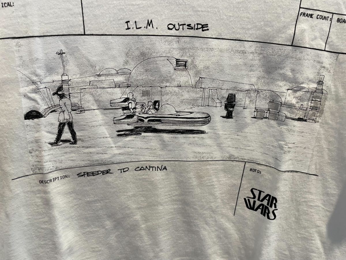 This white tee features a sketch of Luke’s speeder on Tatooine.