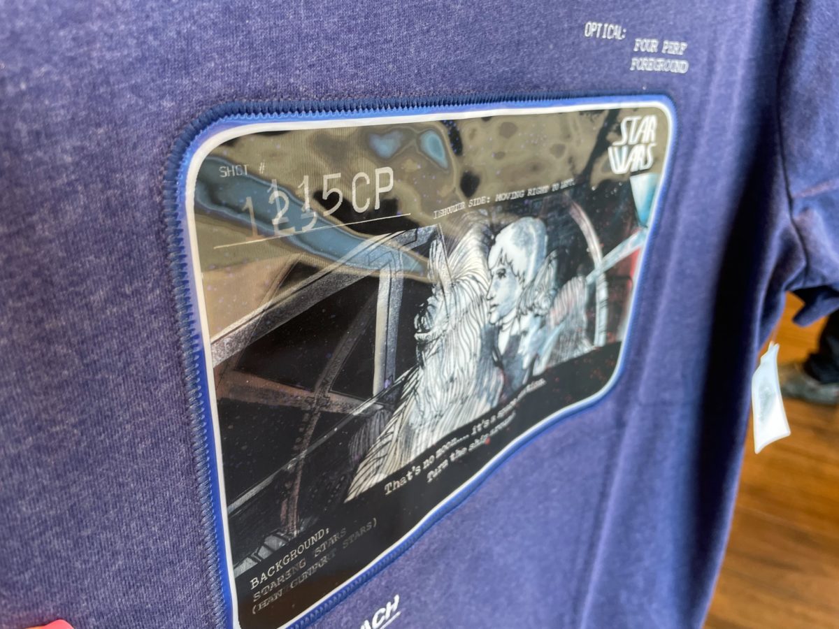 This blue tee has a holographic rectangle on the front. When seen at different angles, it features one of two storyboard images of the main characters inside the Millennium Falcon.