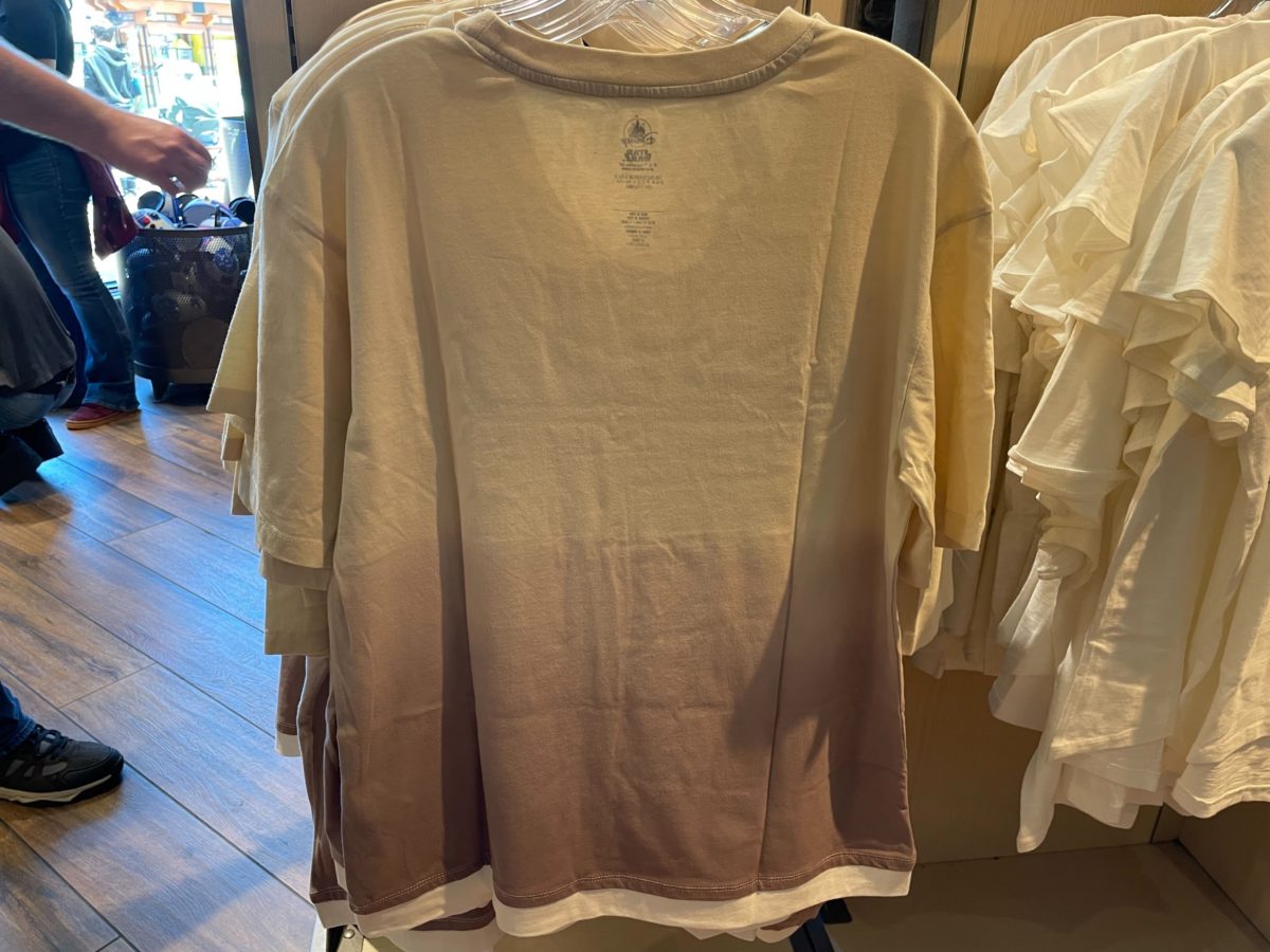 This tee is an ombre tan color, with a white stripe along the bottom.
