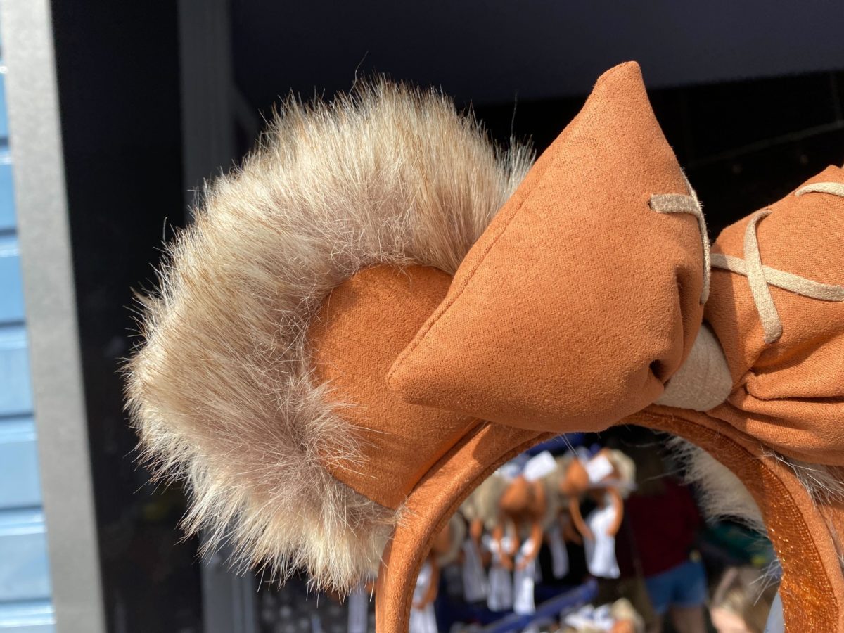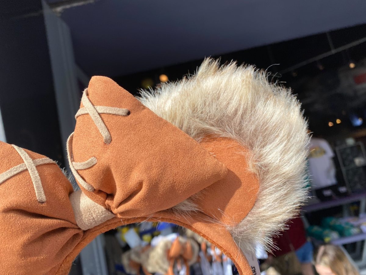 The Minnie bow is made of the same orange-brown fabric, with light brown cross-crossing strings. It resembles not only the clothing worn by Ewoks, but the dress Princess Leia wears while staying in the Ewok village.