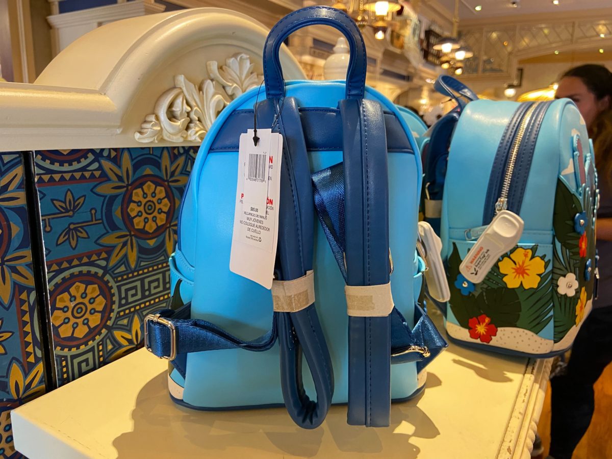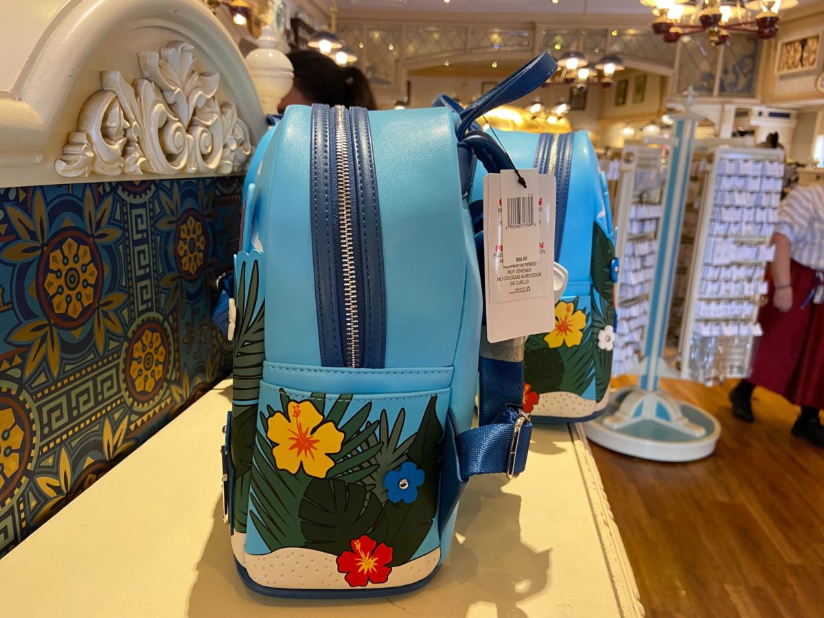 On the front of the backpack, Stitch peeks out from behind colorful flowers and green leaves on a sandy beach. Stitch has his arms wide, as though he’s jumping out of the foliage to surprise you. Stitch can actually be moved up and down, but not removed entirely.