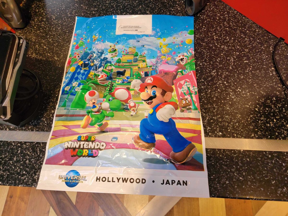The plastic bag depicts Mario and his friends running into Super Nintendo World, with elements of the land pictured in the background. The logo for Universal Parks & Resorts is in the bottom corner. “Hollywood” and “Japan” are printed along the bottom.