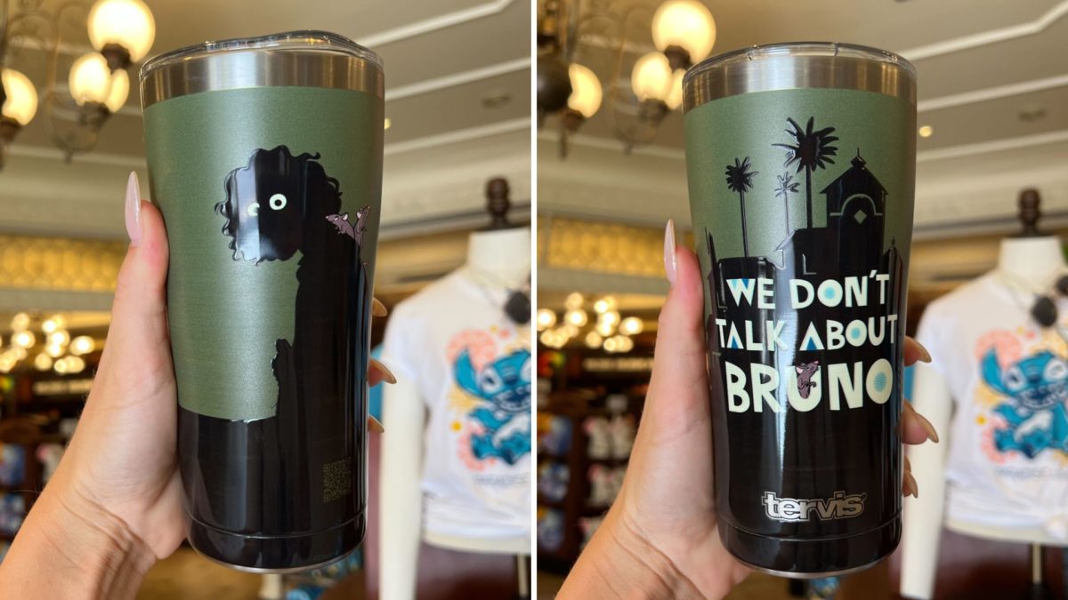 On the other side of the tumbler is the silhouette of the casita, with palm trees rising behind it. “We Don’t Talk About Bruno” is in white letters on top of the house, with a rat sticking out of the “u” in “Bruno.”