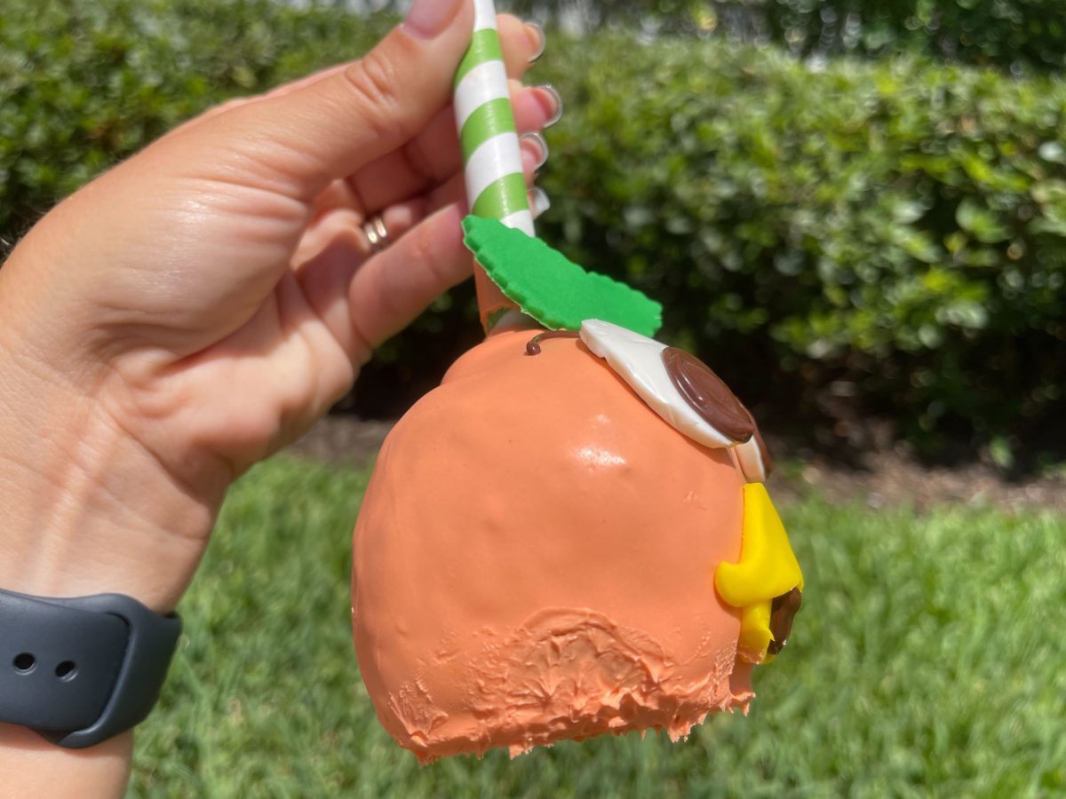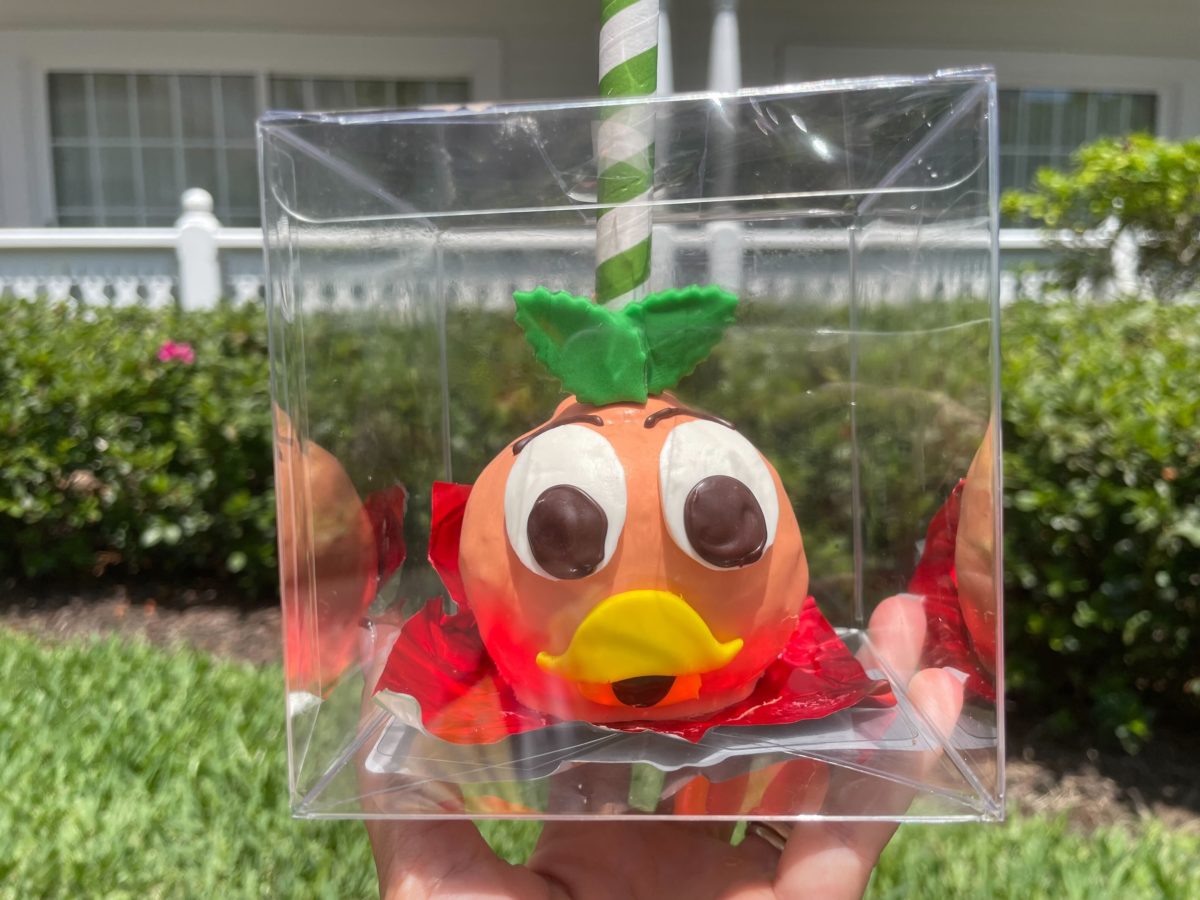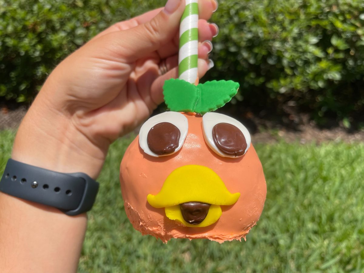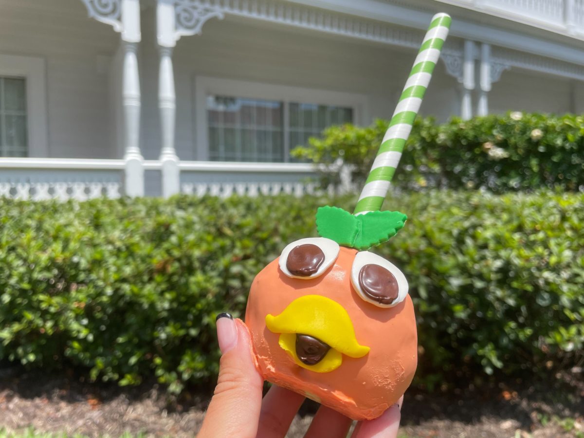 The cake pop resembles Orange Bird’s face, complete with eyes and beak.