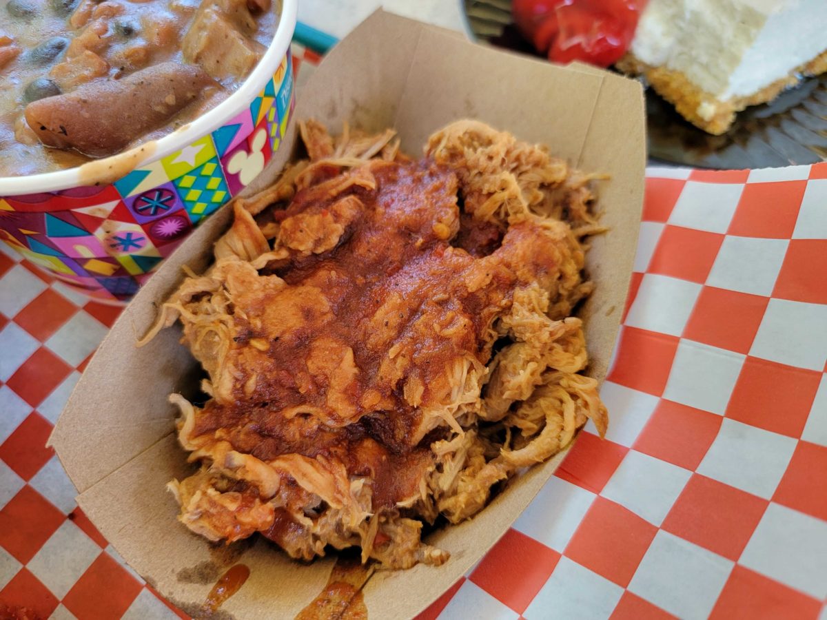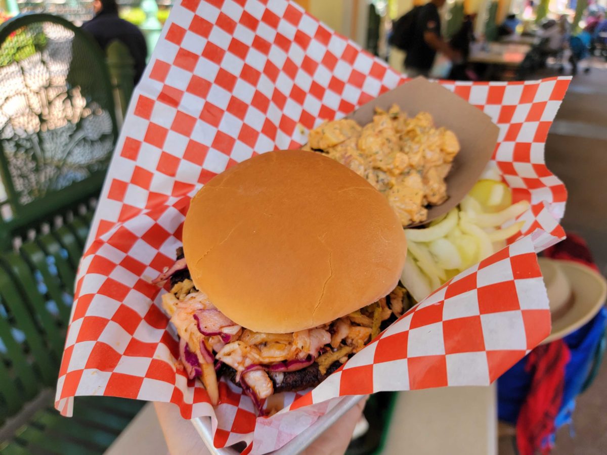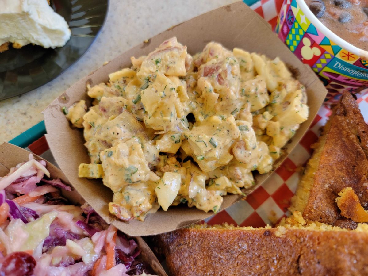 The bacon potato salad is a showstopper. It’s hearty and creamy, and jam-packed with bacon and hard-boiled eggs. This feels like a potato salad you would have at a hometown picnic rather than at a quick-service window in a theme park. We thoroughly enjoyed this potato salad and wish that it was available in entrée size. You can order it separately for $4.99.