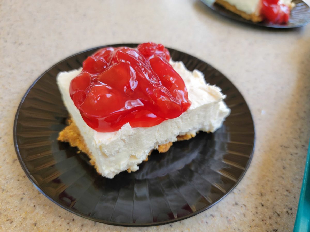 This cheesecake is surprisingly light. It’s fluffy, almost like whipped cream on a graham cracker crust. The canned cherry sauce on top brings a touch of tartness that is welcome, but wouldn’t be missed if it were omitted.