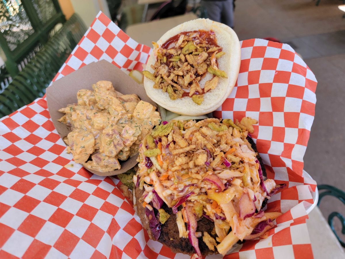 It’s a rather commonplace burger with a touch of barbecue sauce, coleslaw, and fried jalapeños. The plant-based potato salad is fine, somewhat run-of-the-mill, but not unenjoyable.