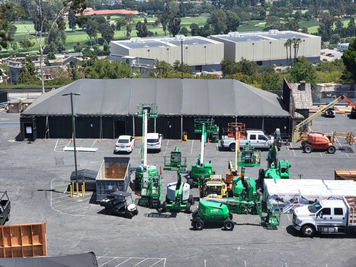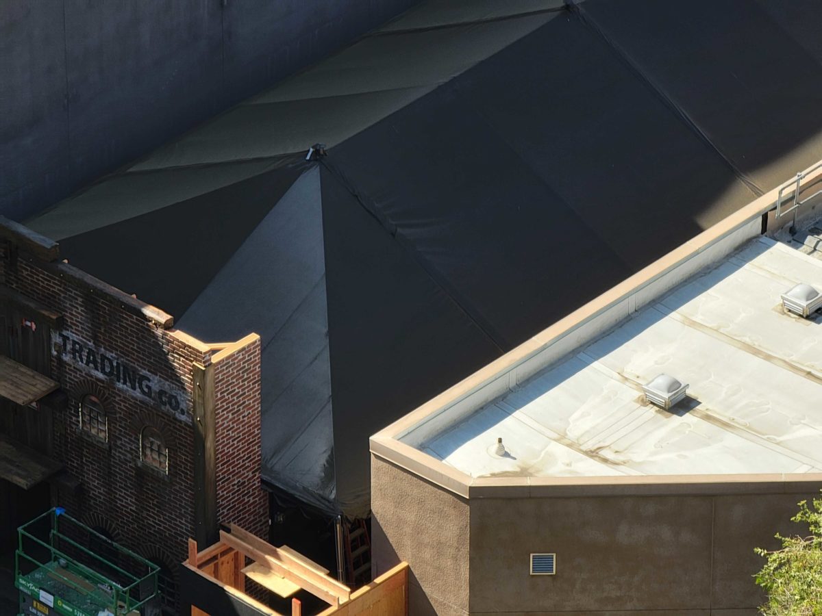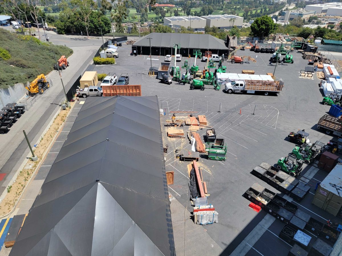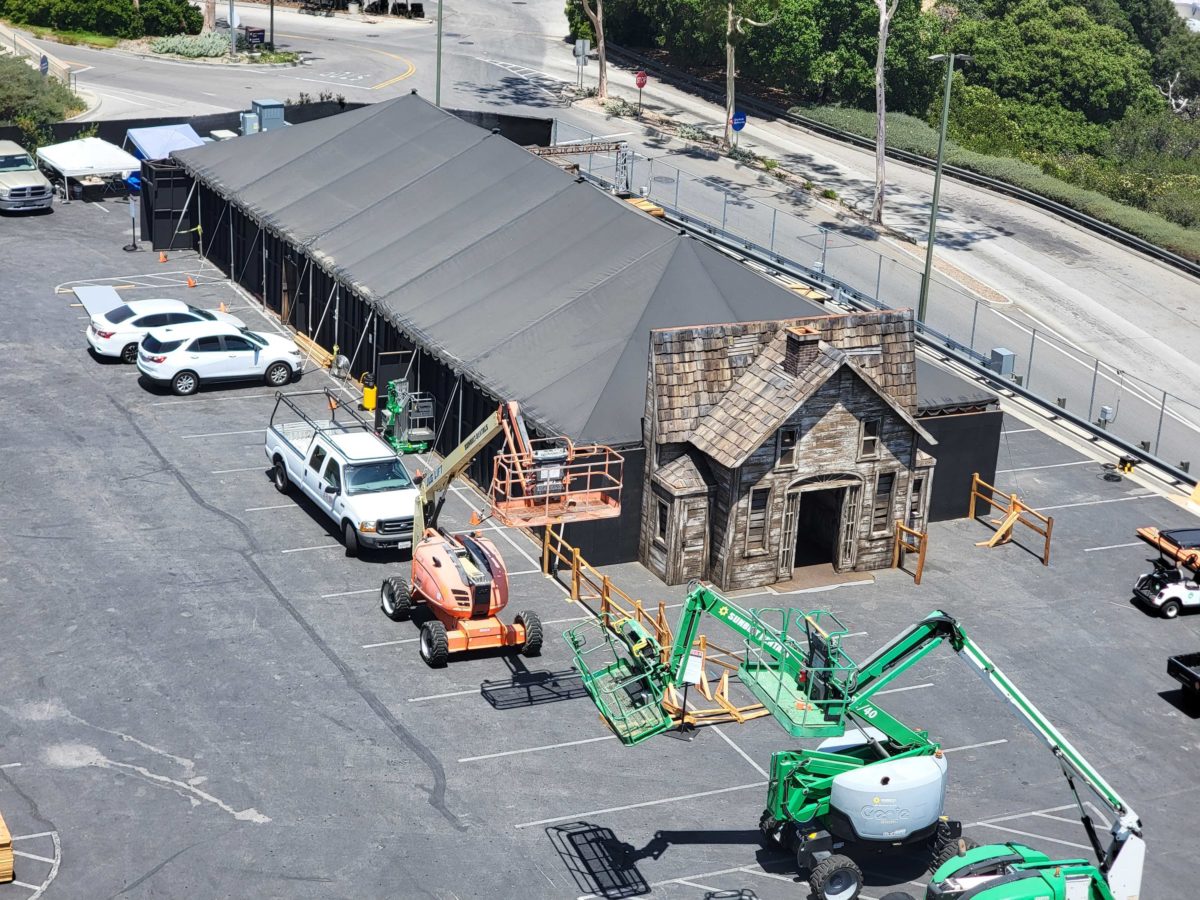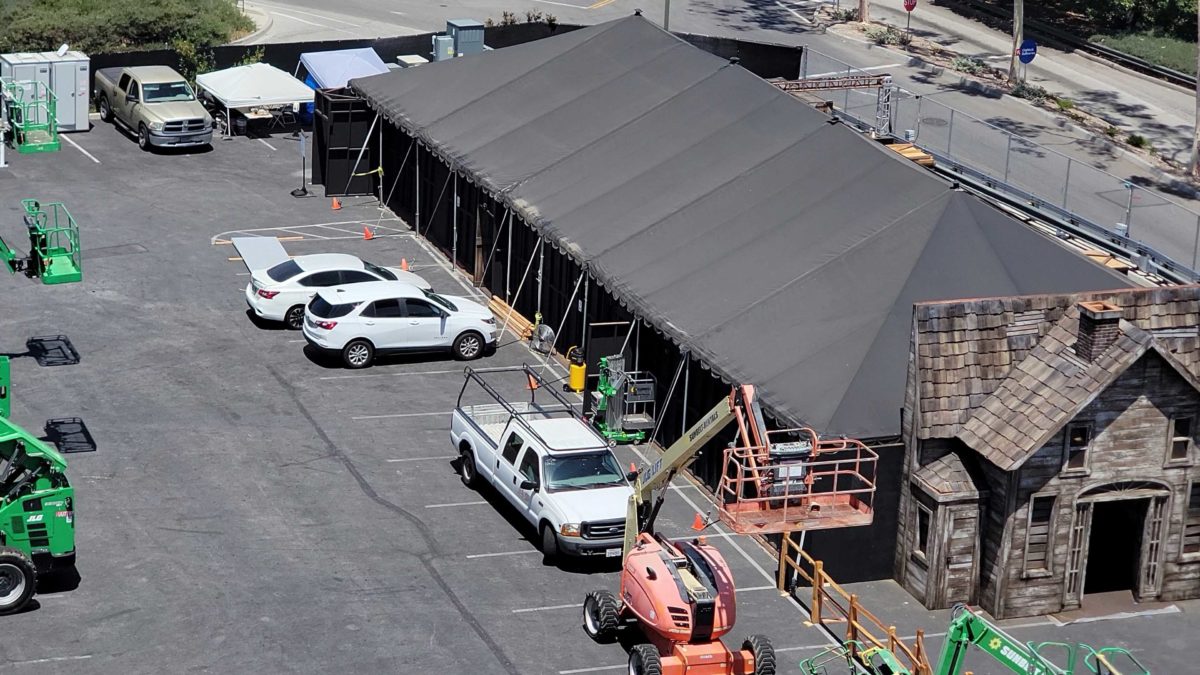 A side view of a large tent. The rundown maze entrance can be seen on the right. Trucks and cherry pickers fill the work area.