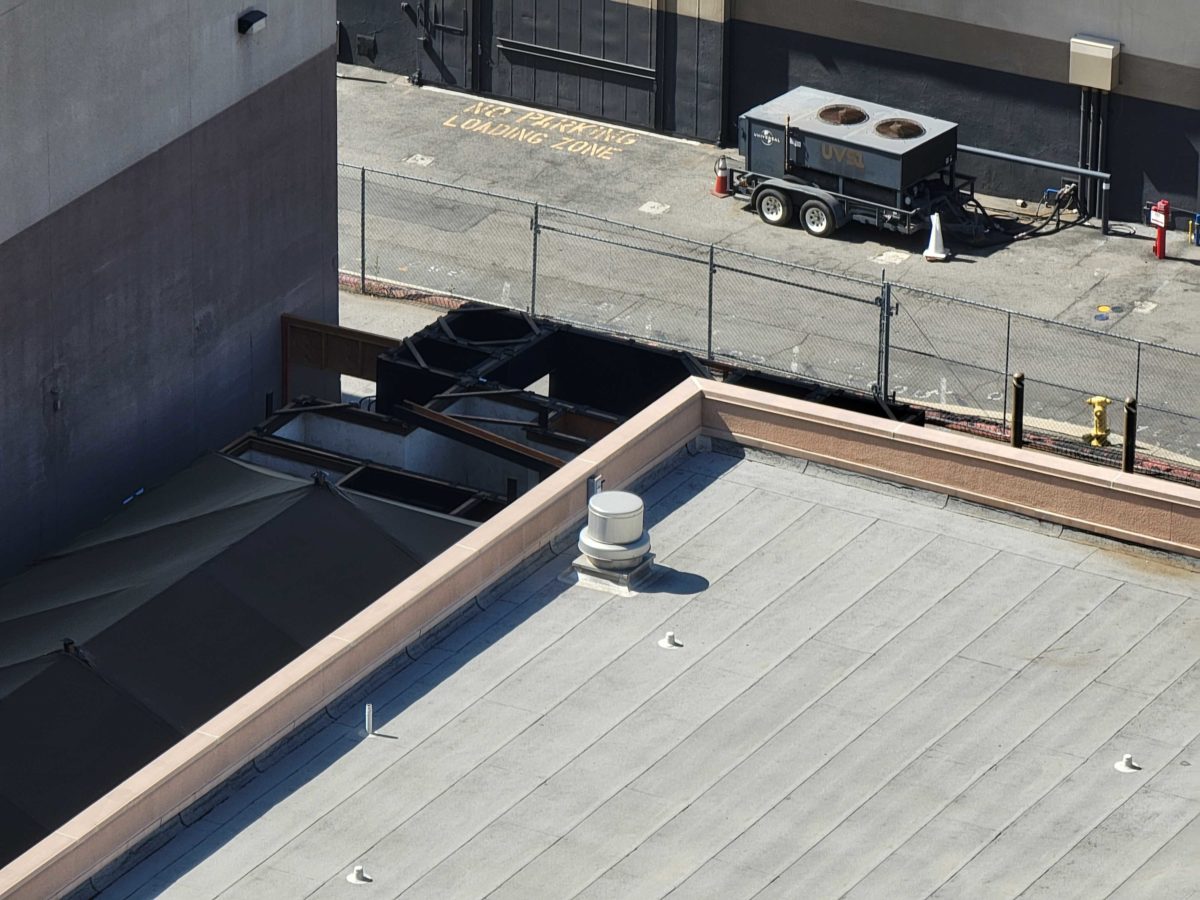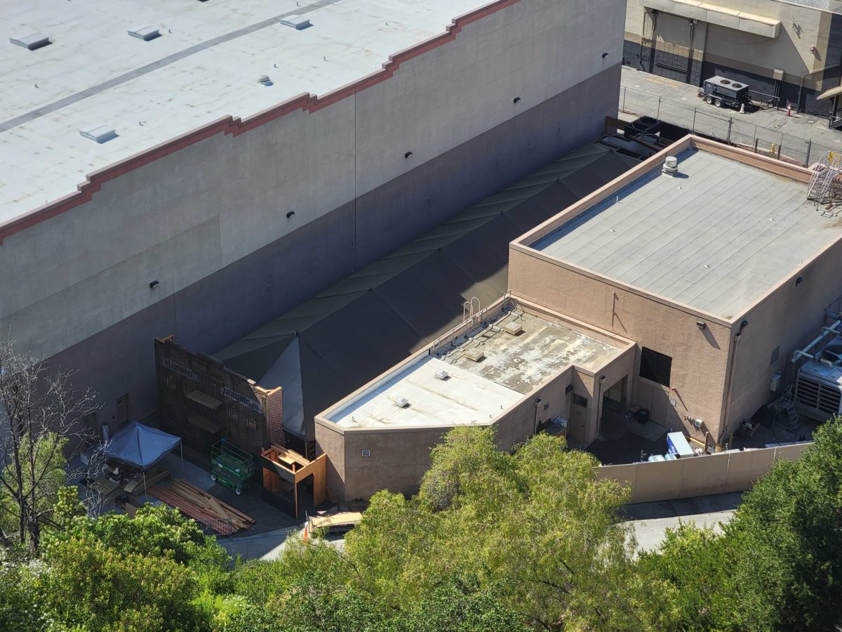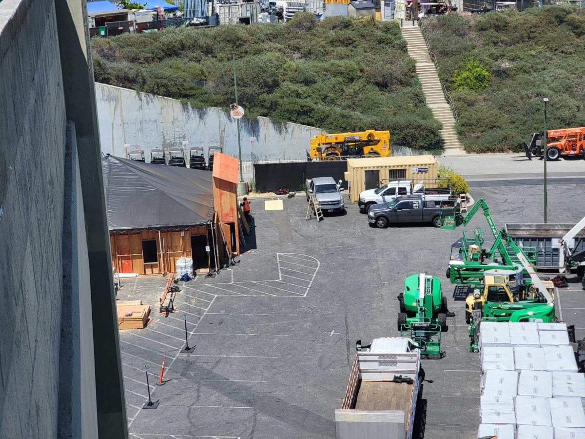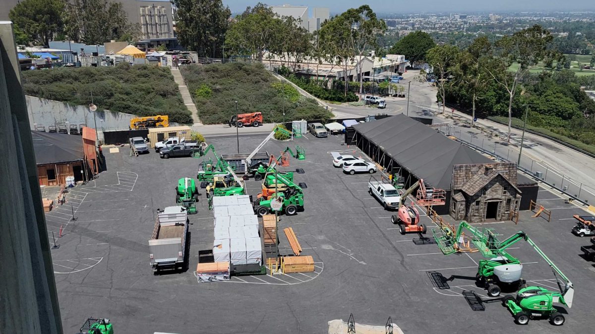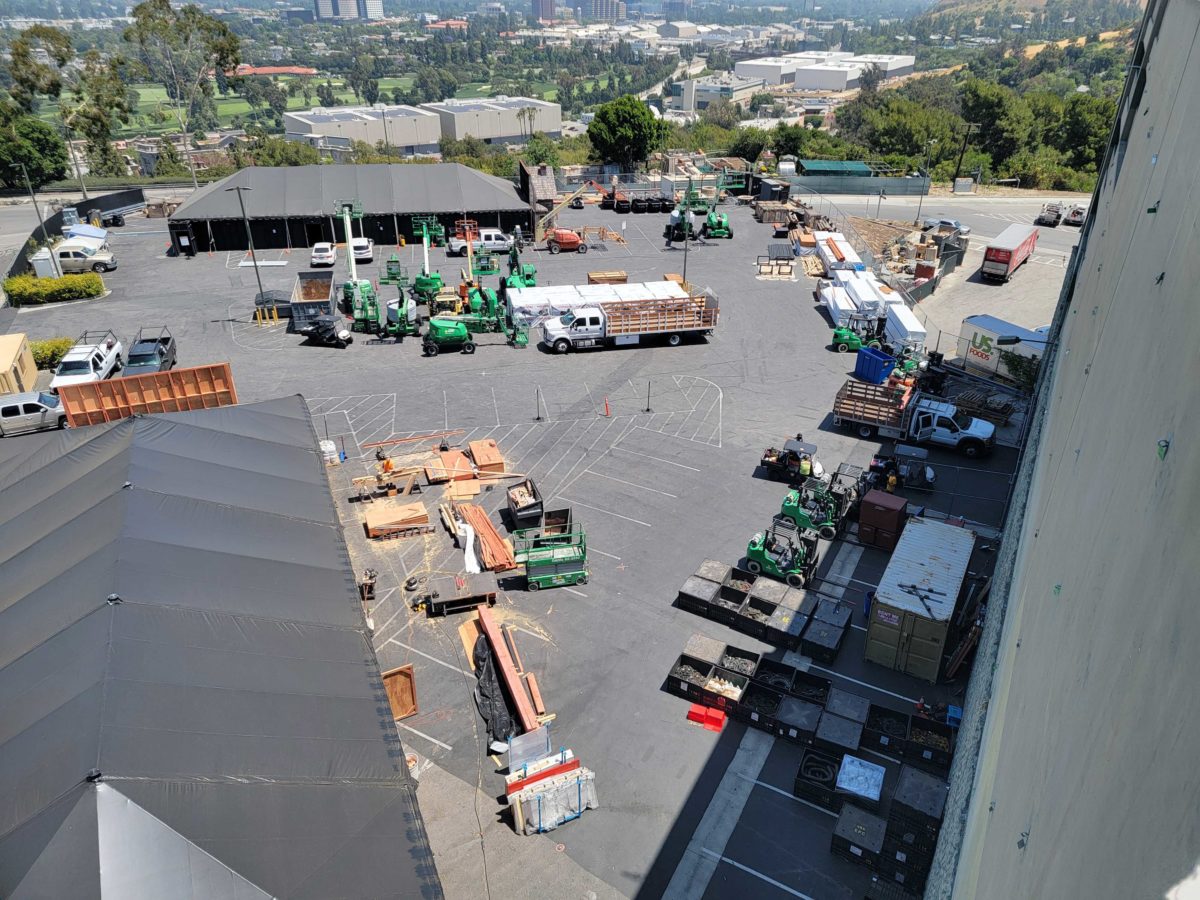 A side view of a large tent. The rundown maze entrance can be seen on the right. Trucks and cherry pickers fill the work area.