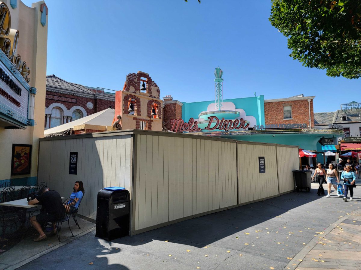 This area is in front of Mel’s Diner. Bells hang from a weather-beaten structure.
